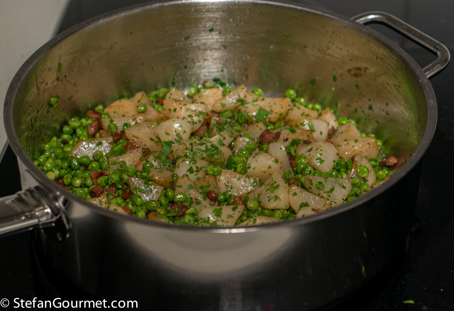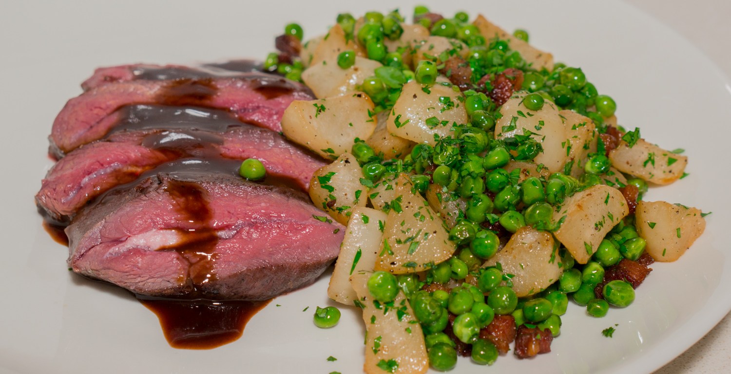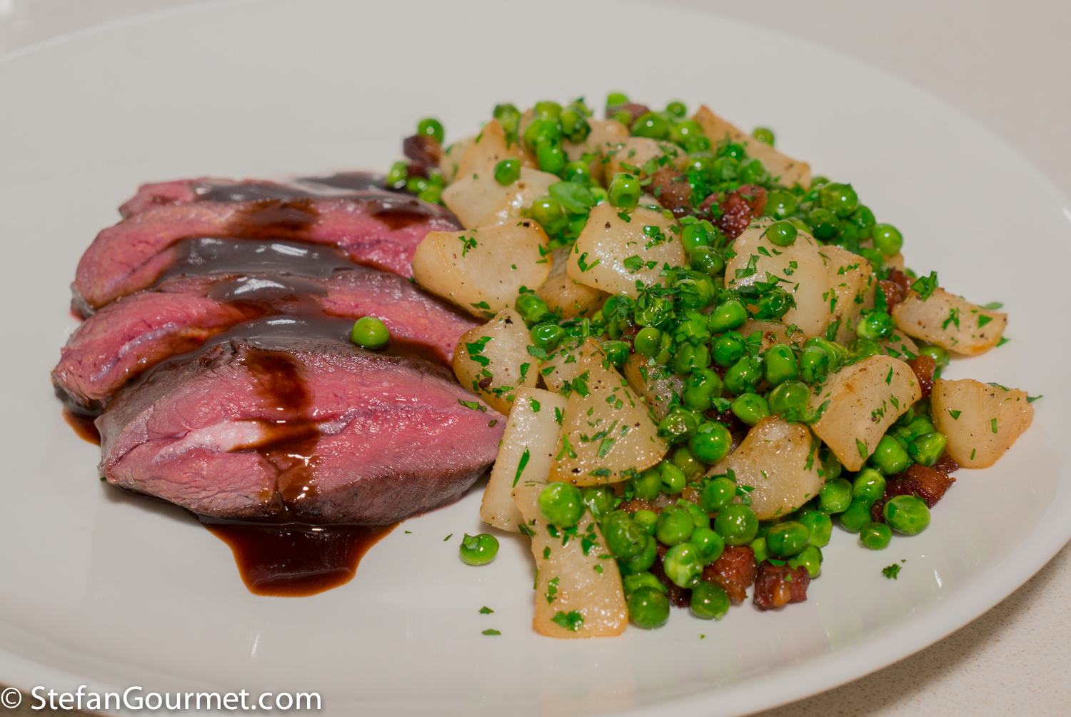 In this recipe, the turnips are sautéed with pancetta and peas, and the combination of the sweet peas with the peppery turnips and the salty pancetta works very well. Here this is served as a side to venison steak, but it would also be a great side to beef or lamb.