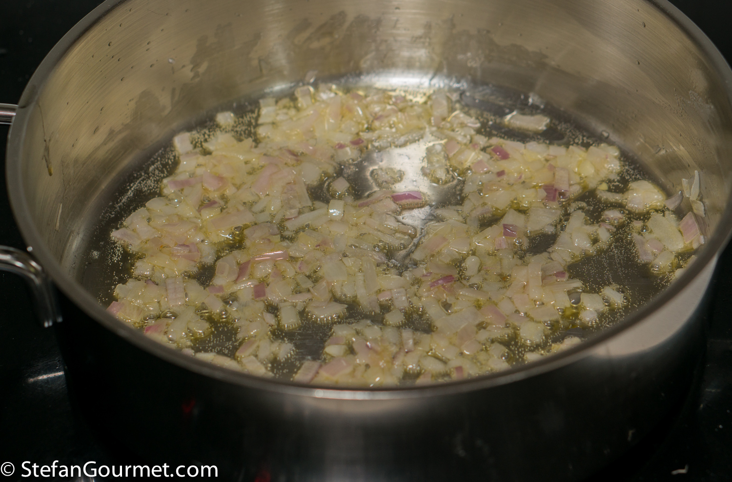 Heat up 750 ml of vegetable stock and keep it hot. Melt two tablespoons of butter in a wide thick-bottomed pan. Add a minced shallot and stir over medium heat until the shallot is soft and fragrant.