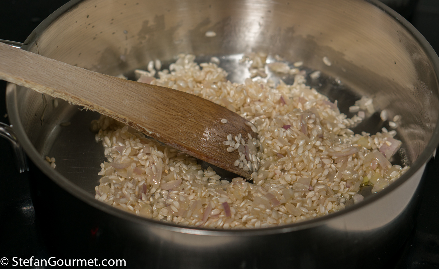 Add 130 grams of risotto rice and stir until the rice is very hot, without burning the onion.