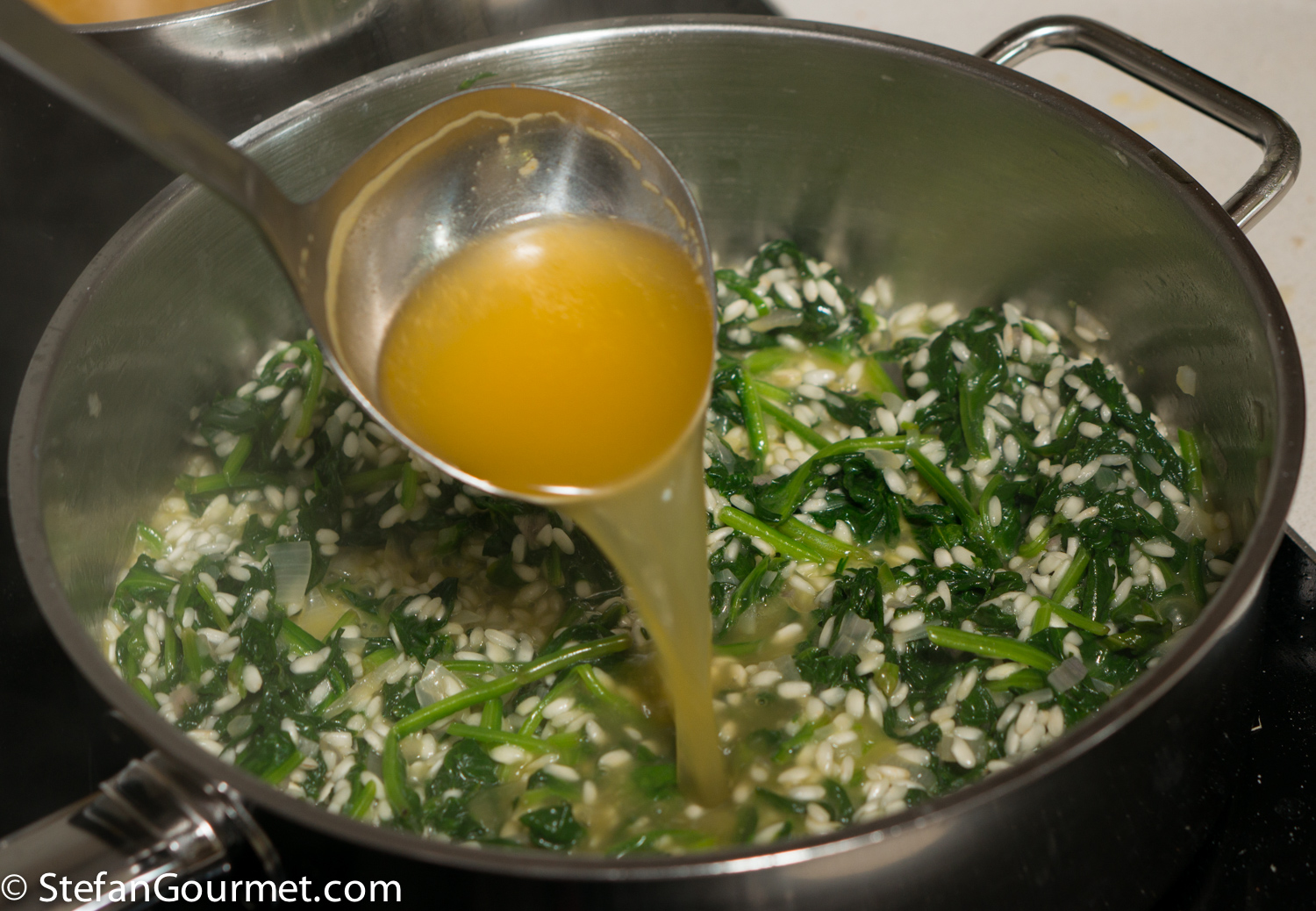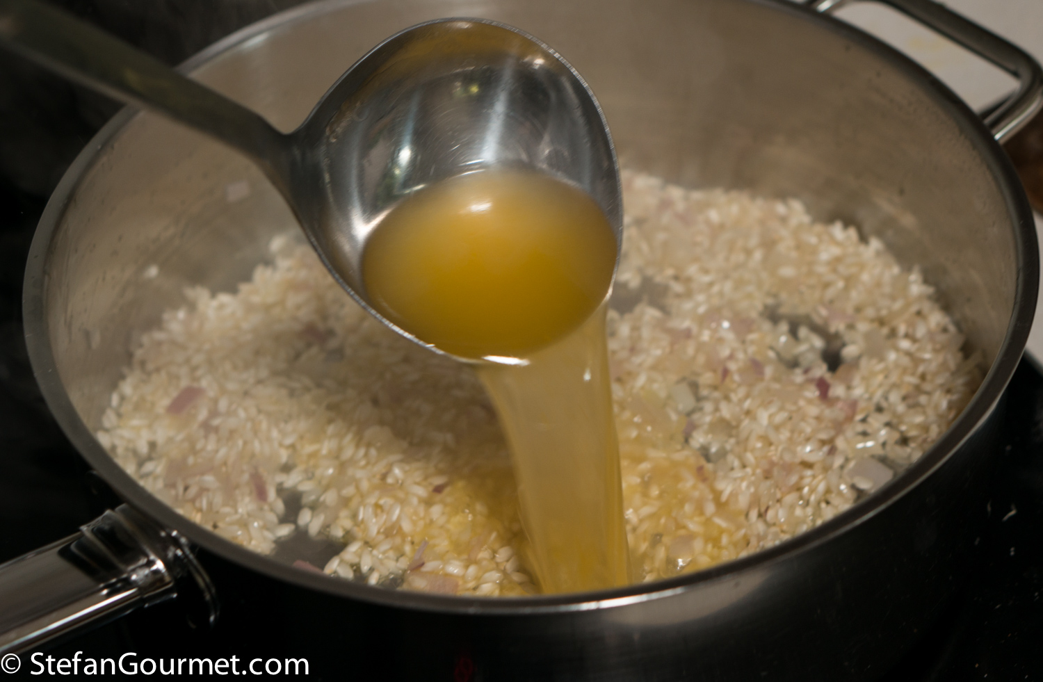Stir over medium heat until the stock has been absorbed by the rice, then add another ladle of stock. Keep stirring and adding stock until the rice is al dente, about 15 minutes. The only way to find out whether the rice is cooked is to taste it; there should not be a hard kernel inside but the rice shouldn’t be soft either.