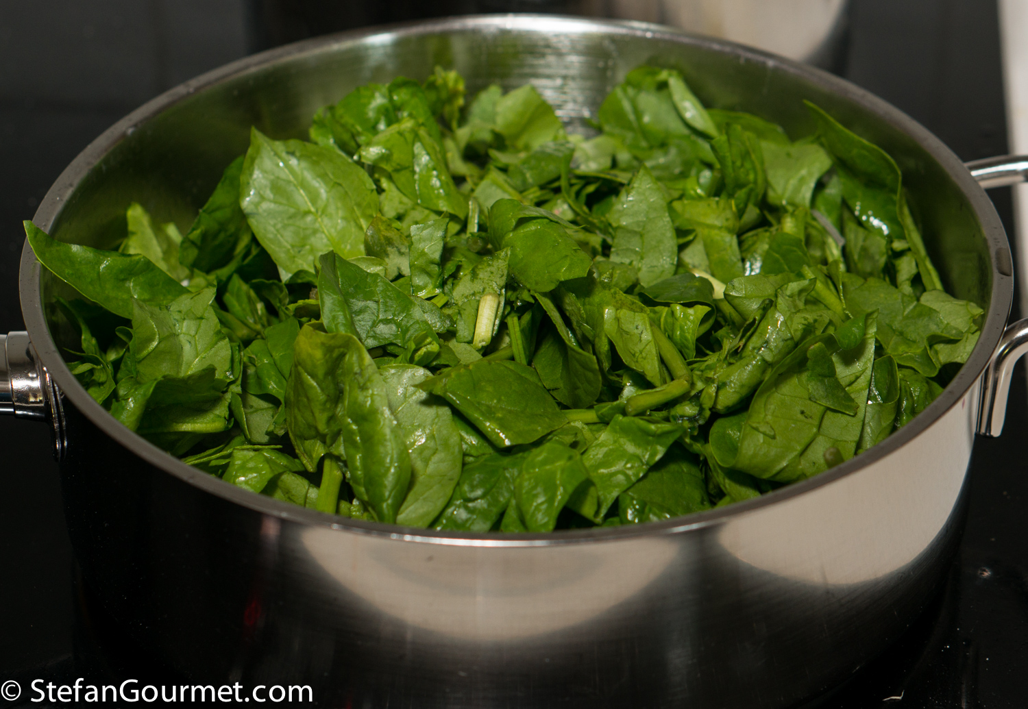 Immediately add 225 grams of spinach, and season with salt. If the spinach is not “baby spinach” (young spinach) remove the stems first.