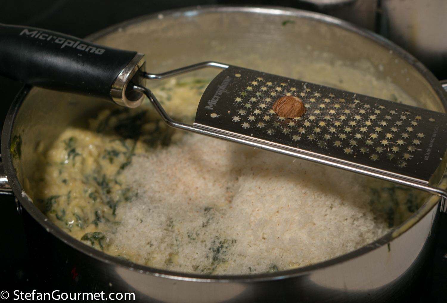 Add 30 grams of freshly grated parmigiano reggiano and a dash of freshly grated nutmeg.