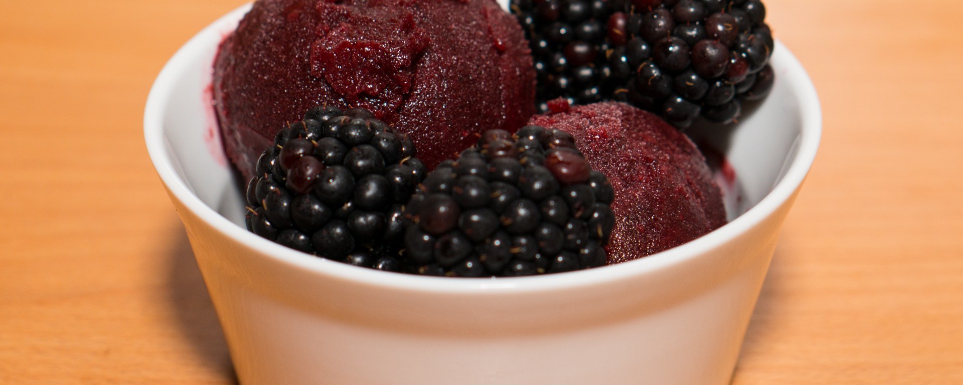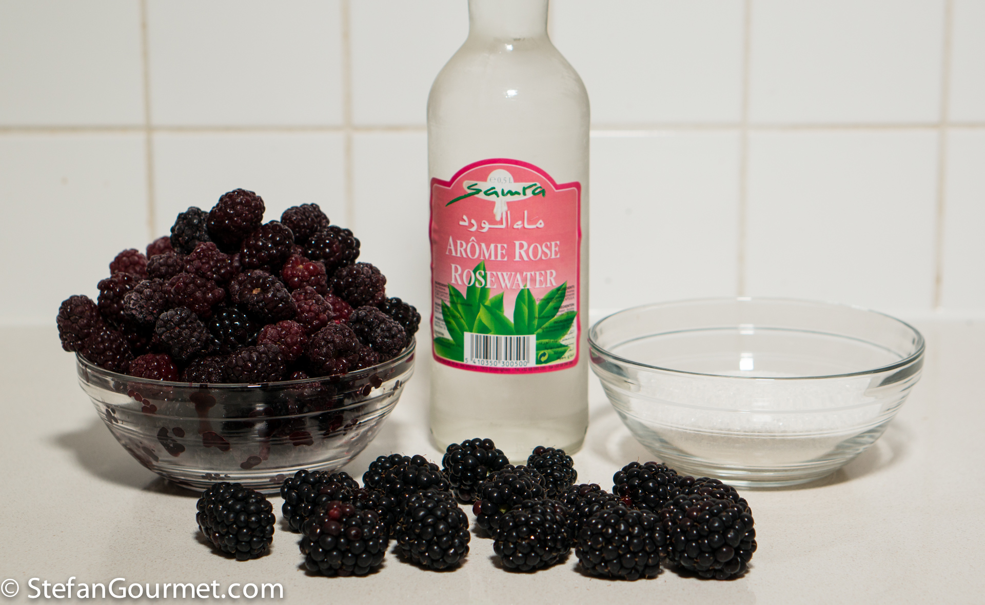 Rosenmuskateller is a rare dessert wine from Alto Adige/Südtirol, the German speaking north-east of Italy. It is made from the rare grape of the same name, related to other muscat grapes but with the distinctive quality that it smells of roses! I thought it would be great to pair this with a dessert that includes rose water, which is flavored water made by steeping rose petals in water. And so I came up with blackberry rose water sorbet, and guess what? It was fantastic. The sorbet by itself because it has an amazing rose scent and the rose works very well with blackberries, but paired with a glass of Rosenmuskateller it was heavenly. Here’s what I did…