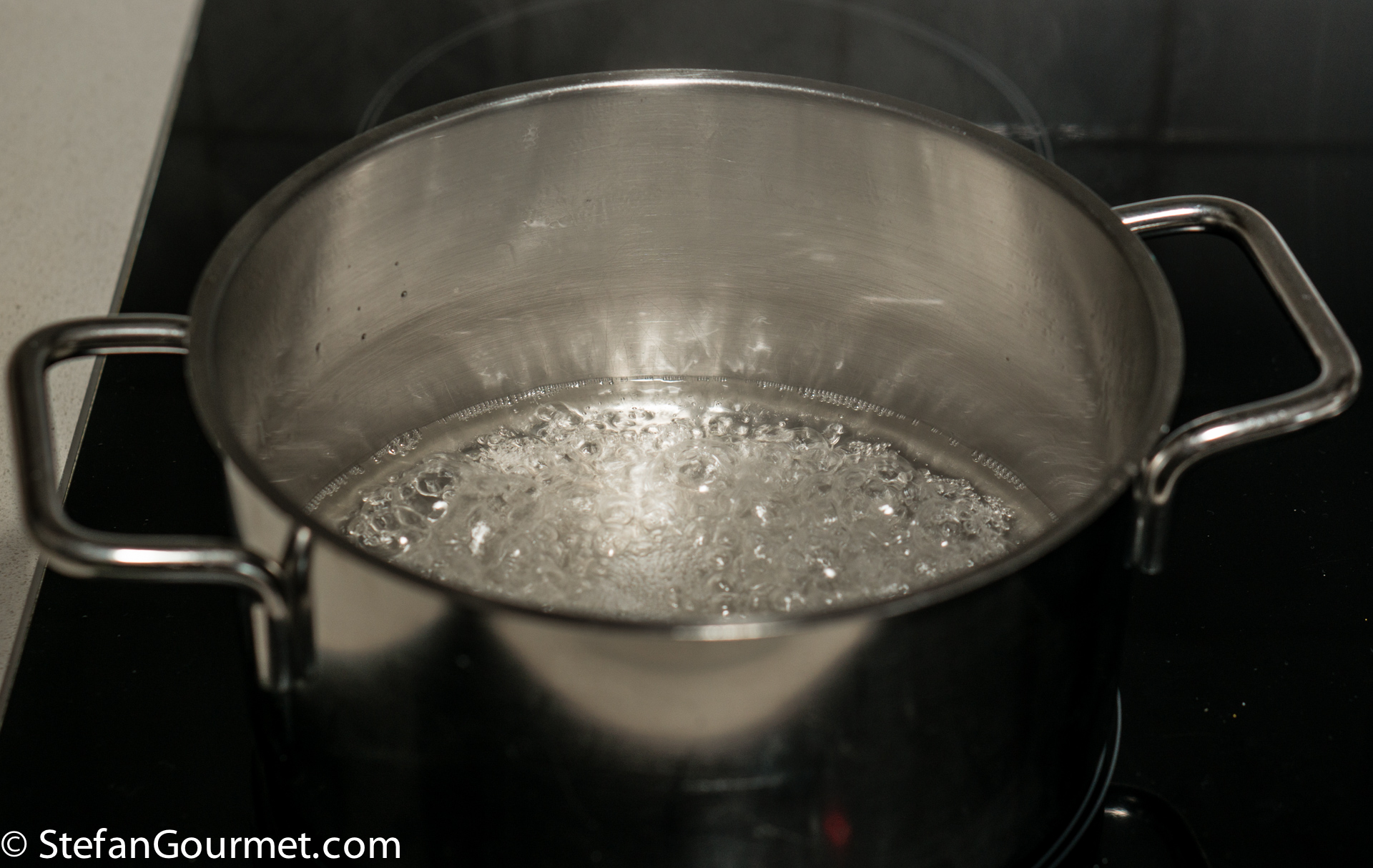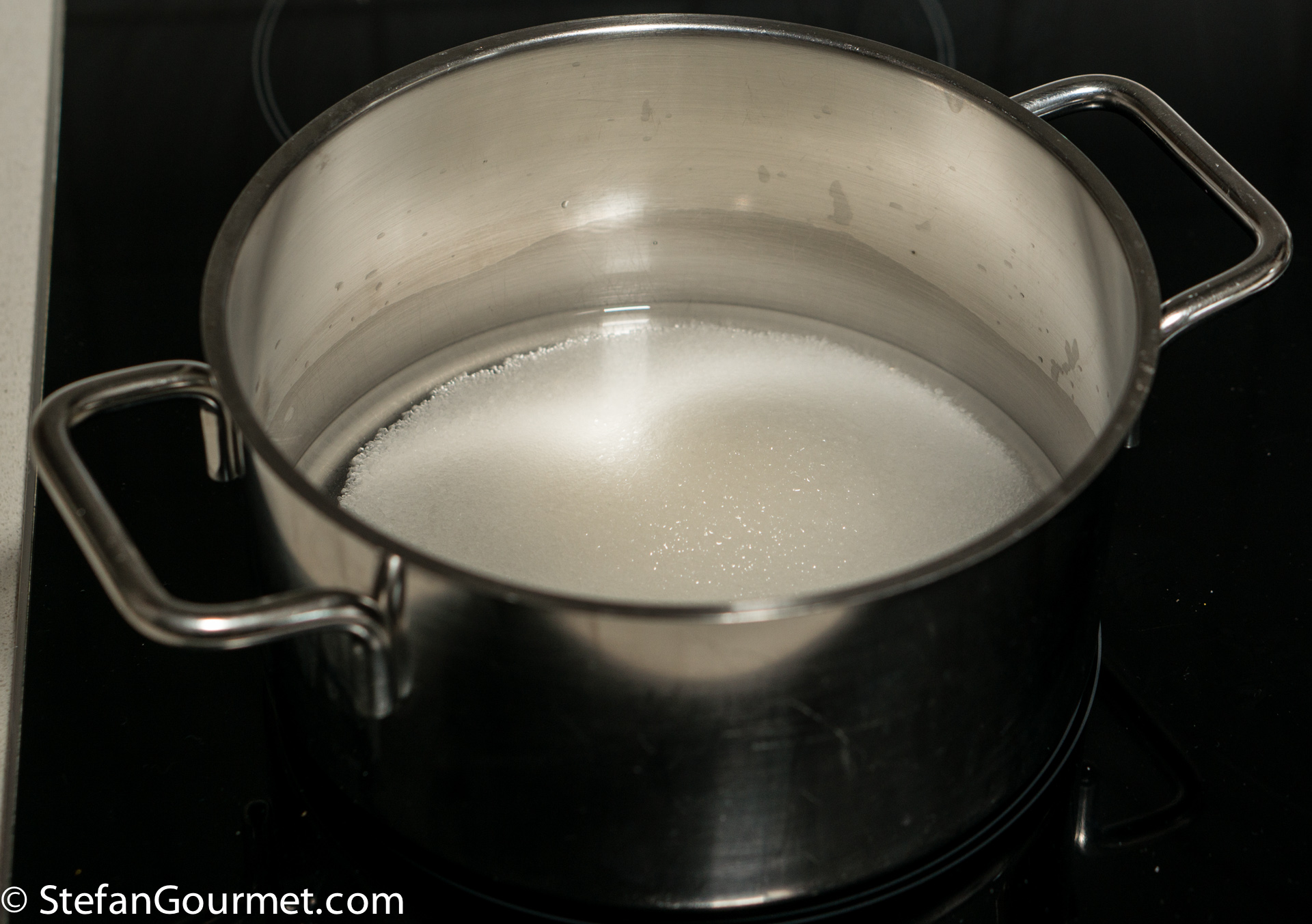 Start by making a simple syrup. Combine 150 grams sugar with 150 grams water in a saucepan.