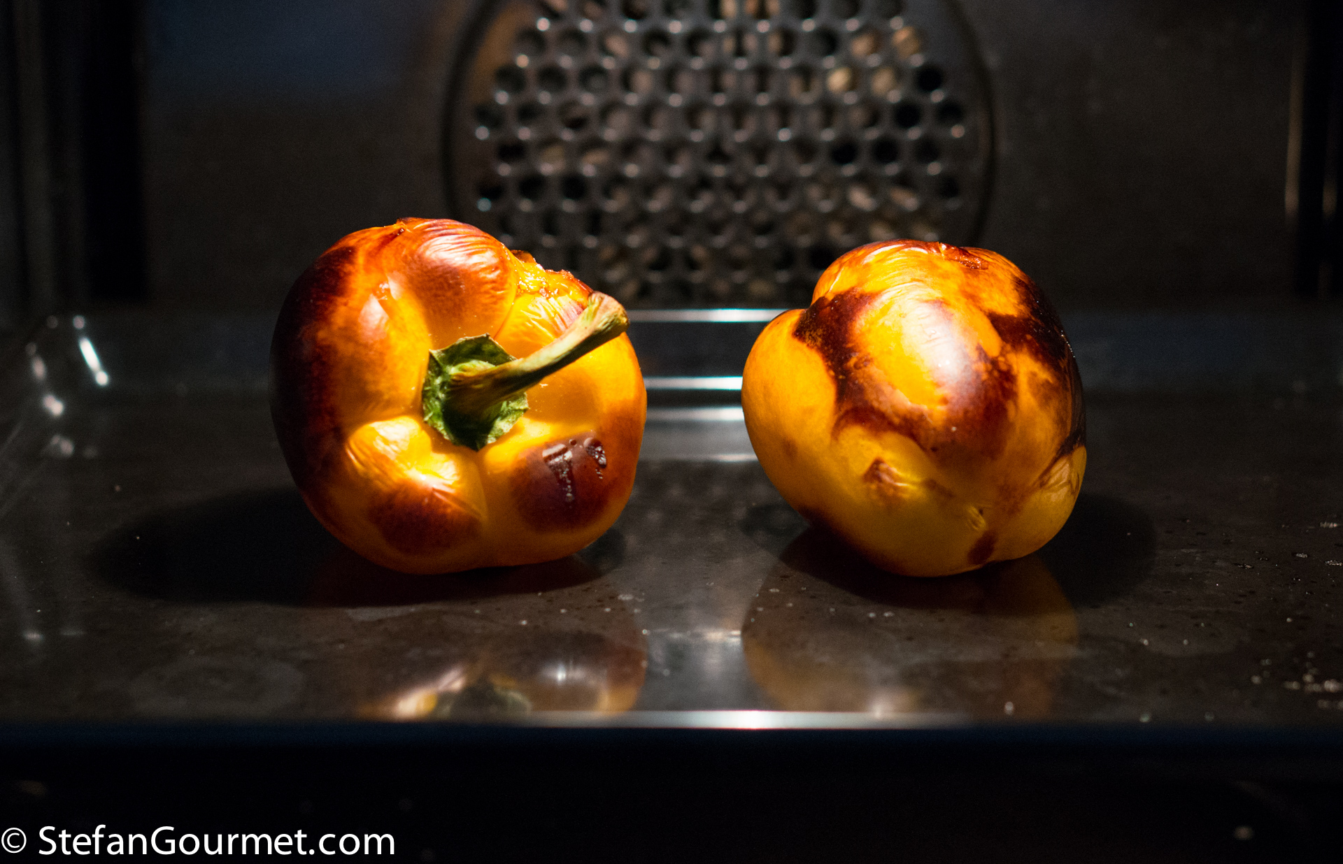 Preheat the oven to 250C/480F. Roast the bell peppers at that temperature for 25 minutes, or until well browned.