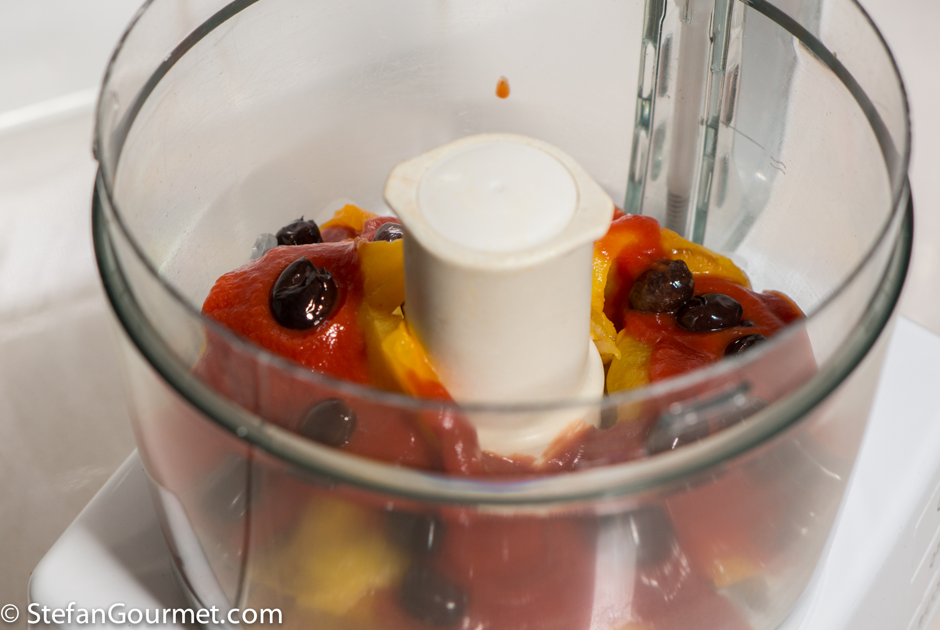 Put the bell peppers in a food processor with 25 grams of pitted black olives and 90 grams of sieved tomatoes.