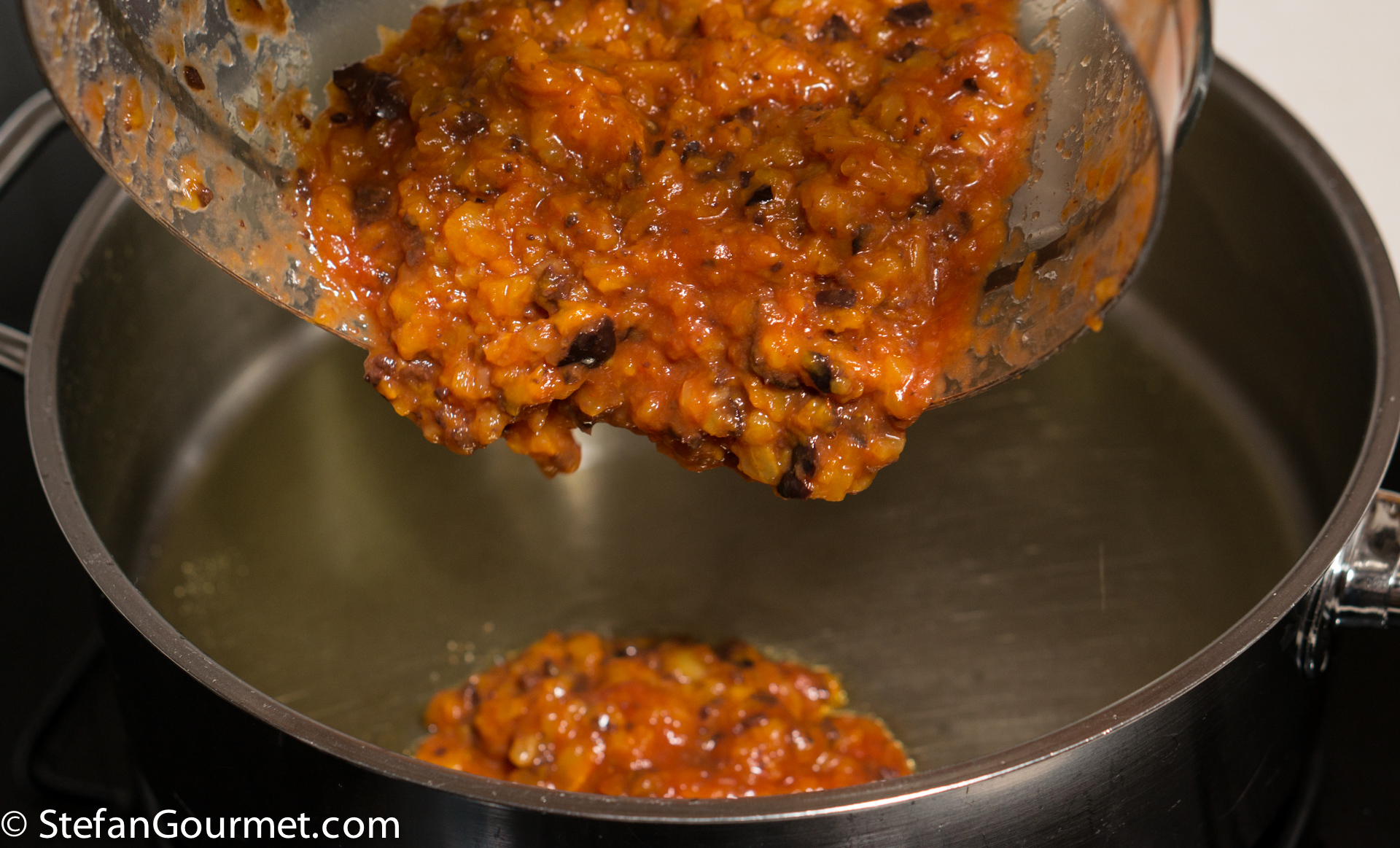 Pulse as many times as needed to get a coarse puree. There shouldn’t be any large pieces left, but it shouldn’t be smooth either.