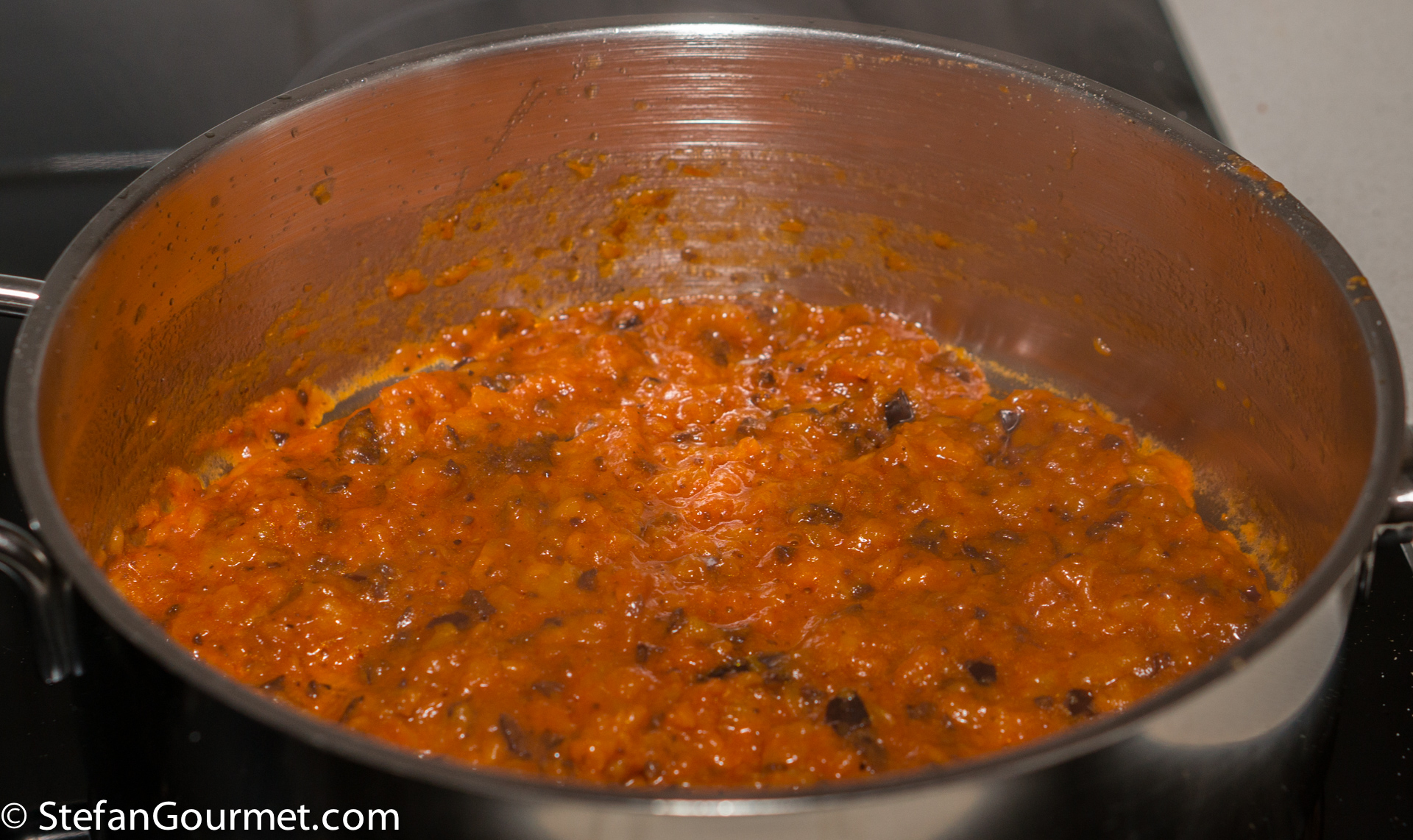 You can of course select the pasta shape that will match your choice of sauce, but in today’s an yesterday’s post I have demonstrated that you can also adapt the sauce to the pasta shape. Both dishes use the same ingredients: bell peppers, olives, pasta, tomato puree, olive oil, garlic, salt, and pepper. With the same simple ingredients, you can make two pasta dishes that are both delicious but quite different. Yesterday’s dish with spaghetti tastes very differently from yesterday’s penne. This is in part due to the different mouthfeel, and in part due to the flavor added by roasting the bell peppers. Although both dishes are good, Kees and I both preferred the spaghetti version.