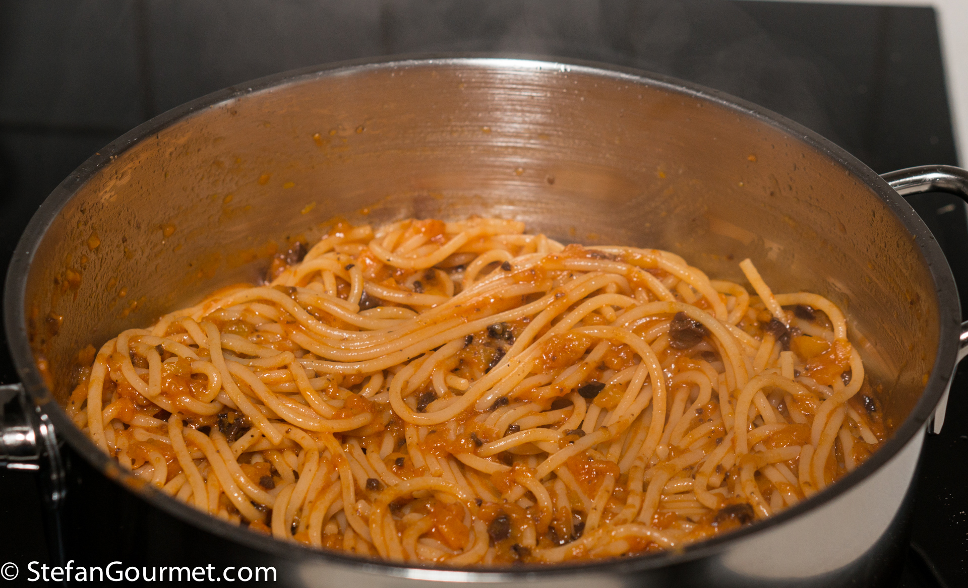 When the timer beeps, drain the spaghetti and add to the sauce.