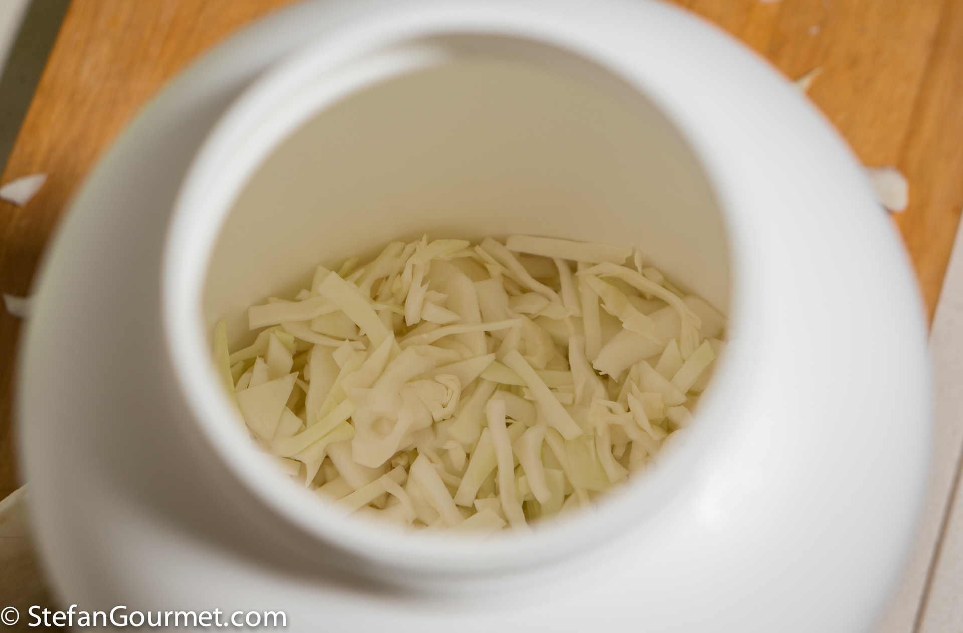Nowadays we can buy sauerkraut in the supermarket, but it is more fun and more delicious to make it yourself. I had never done so yet, but it turns out to be quite easy. The only ingredients you absolutely need are cabbage and salt. You could add optional herbs and spices (like bay leaves and juniper berries) or white wine. And you could get the fermentation started by adding some buttermilk or yogurt, but that really isn’t necessary.