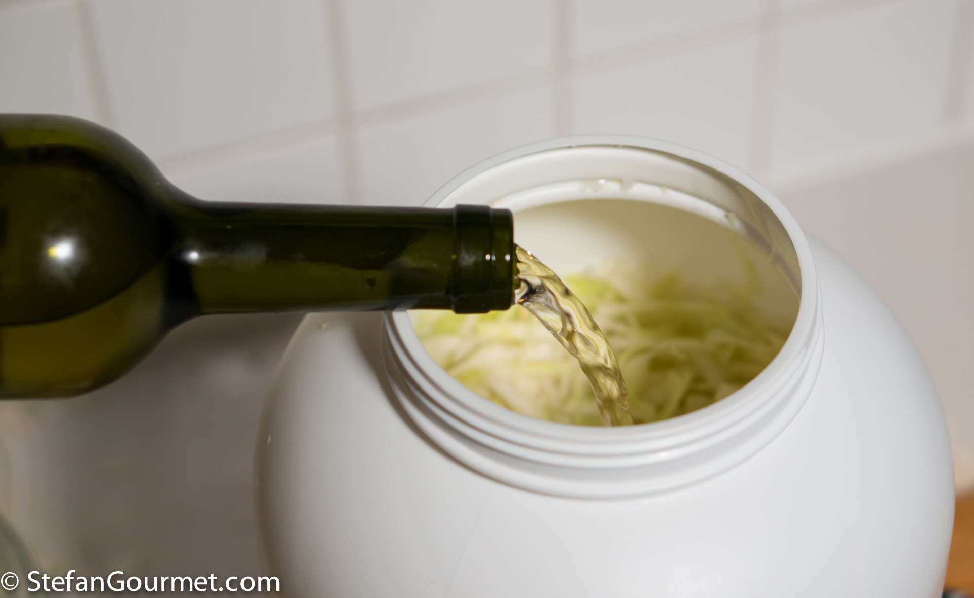Hey Stefan … I don’t know if you saw my post on homemade sauerkraut back on November 5, or not. That was actually a batch I made at least a month or two before the post date.. Since then I made another batch and I *did* add some white wine but only after the main lactic acid ferment seemed to have ended. The taste was terrific… However, I was hesitant to add wine before ferment as I assumed the sulphites generally used by winemakers to halt fermentation might be a problem. It is interesting to see your result!