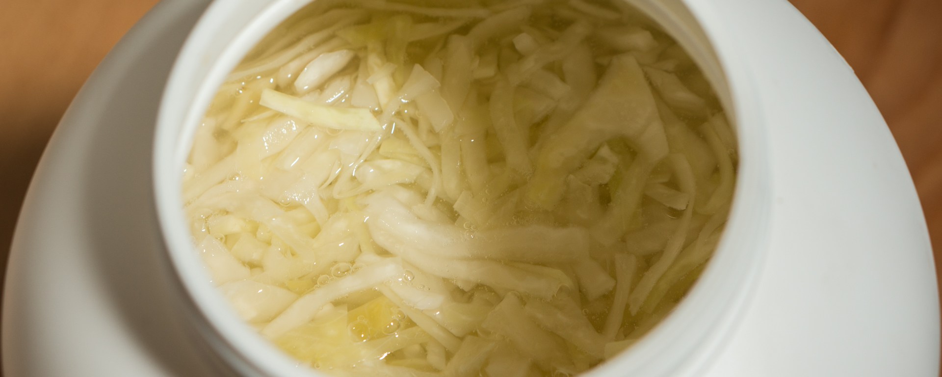 You are now supposed to put something heavy on top of the cabbage to keep it submerged. The cabbage will only ferment when it is not exposed to oxygen. Since the opening of the container I used wasn’t large enough, I skipped that step and decided to stir the top layer once in a while instead.