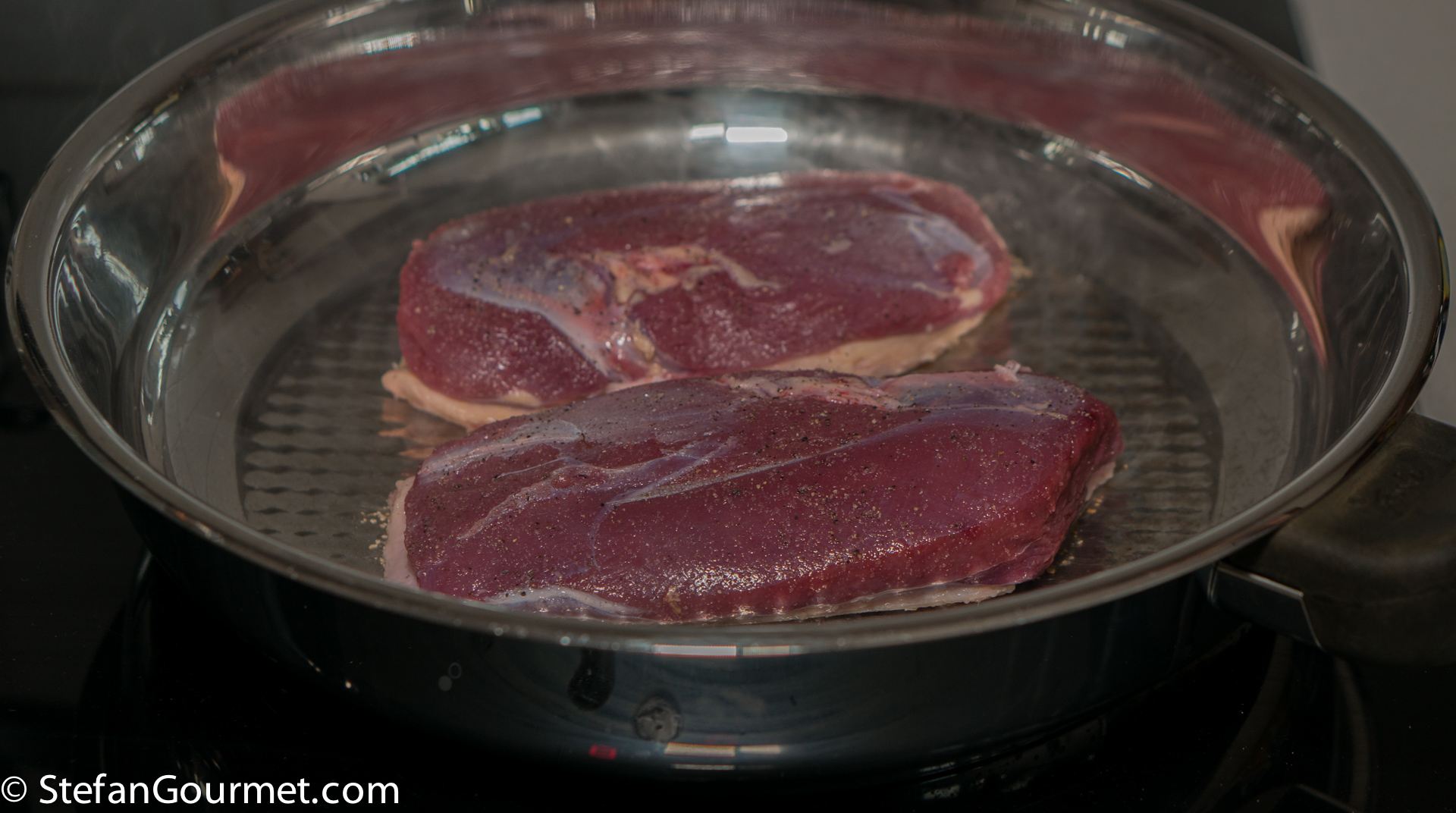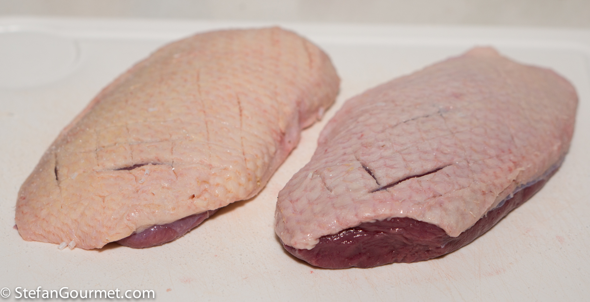 With a sharp knife, carve a diamond pattern in the skin/fat side of the duck breast. Make sure to cut only the skin, not into the meat. Season with salt on both sides and with freshly ground black pepper on the flesh side.
