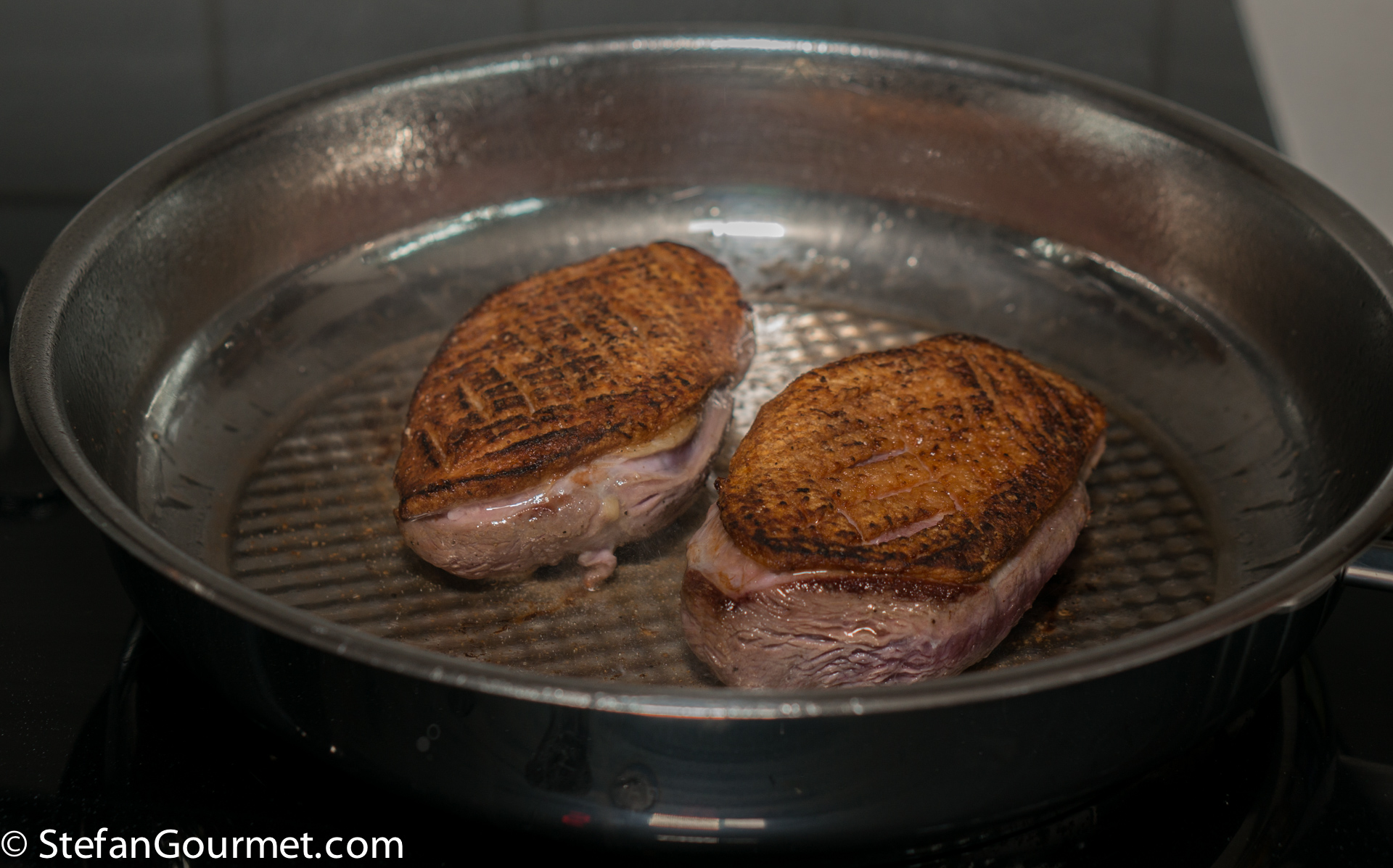 Heat a frying pan over medium-high heat, then heat the duck breasts, skin side down. There is no need to add any butter or oil, as fat will render from the skin.