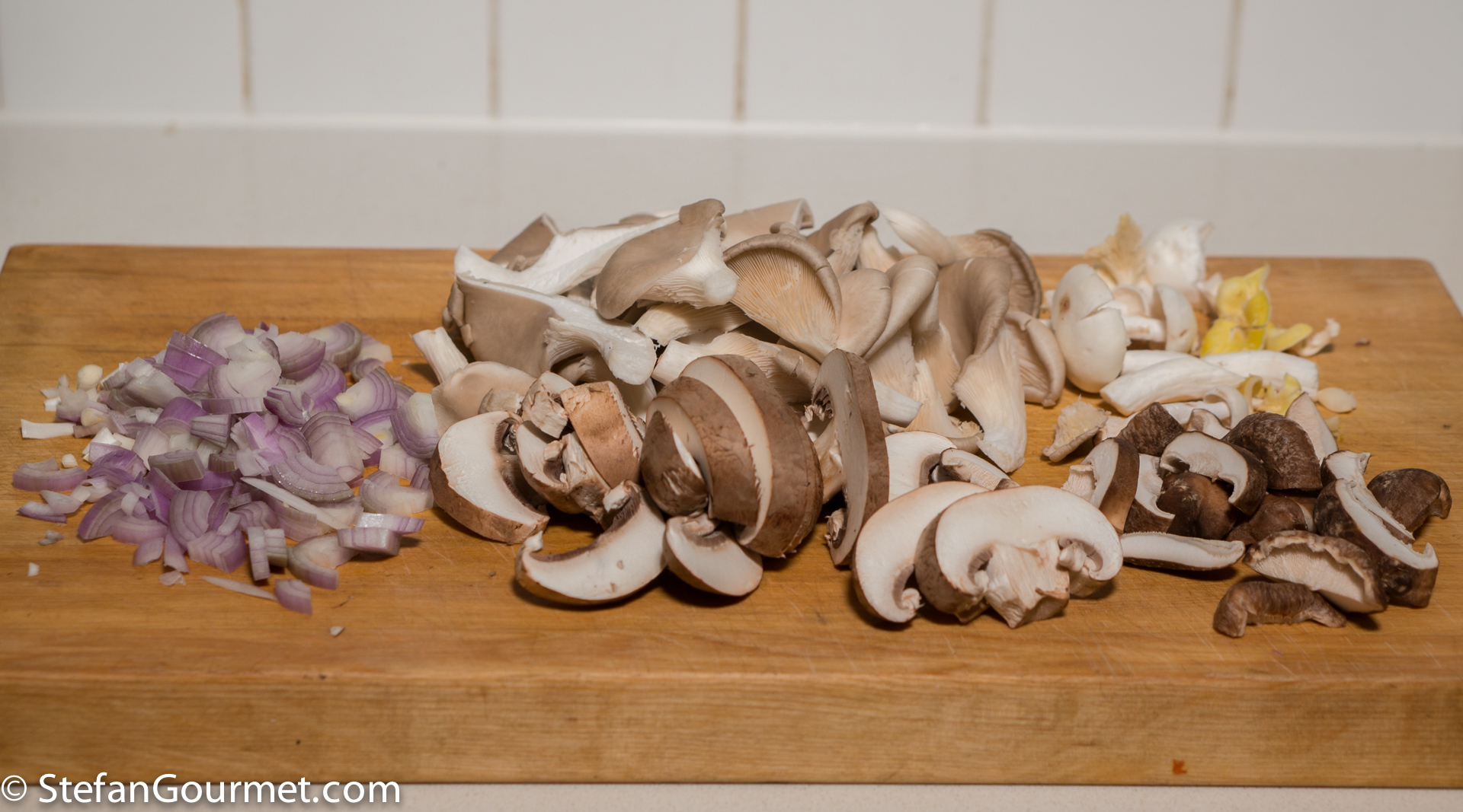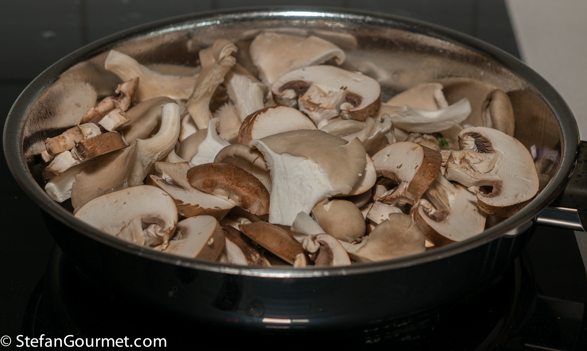 While the duck is cooking, slice 2 shallots and 450 grams of mixed mushrooms.