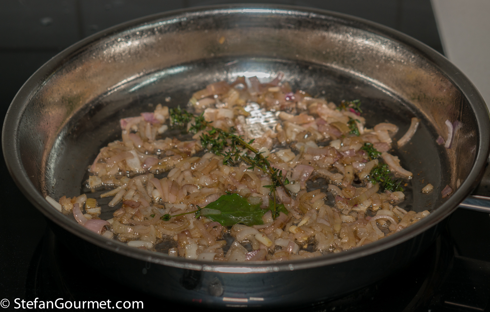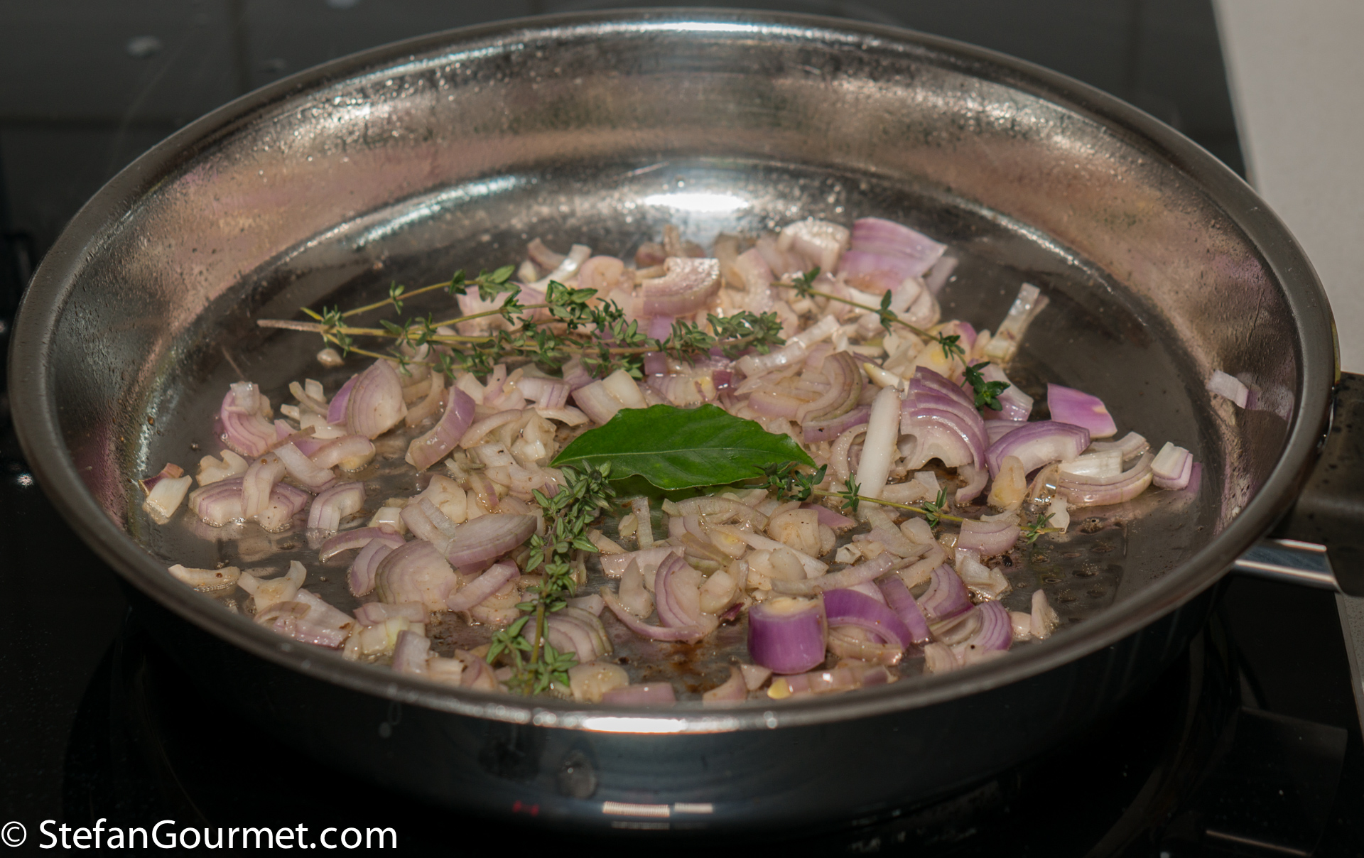 Put the shallots in the frying pan with the duck drippings, together with a bay leaf and some fresh thyme. Season with a bit of salt.