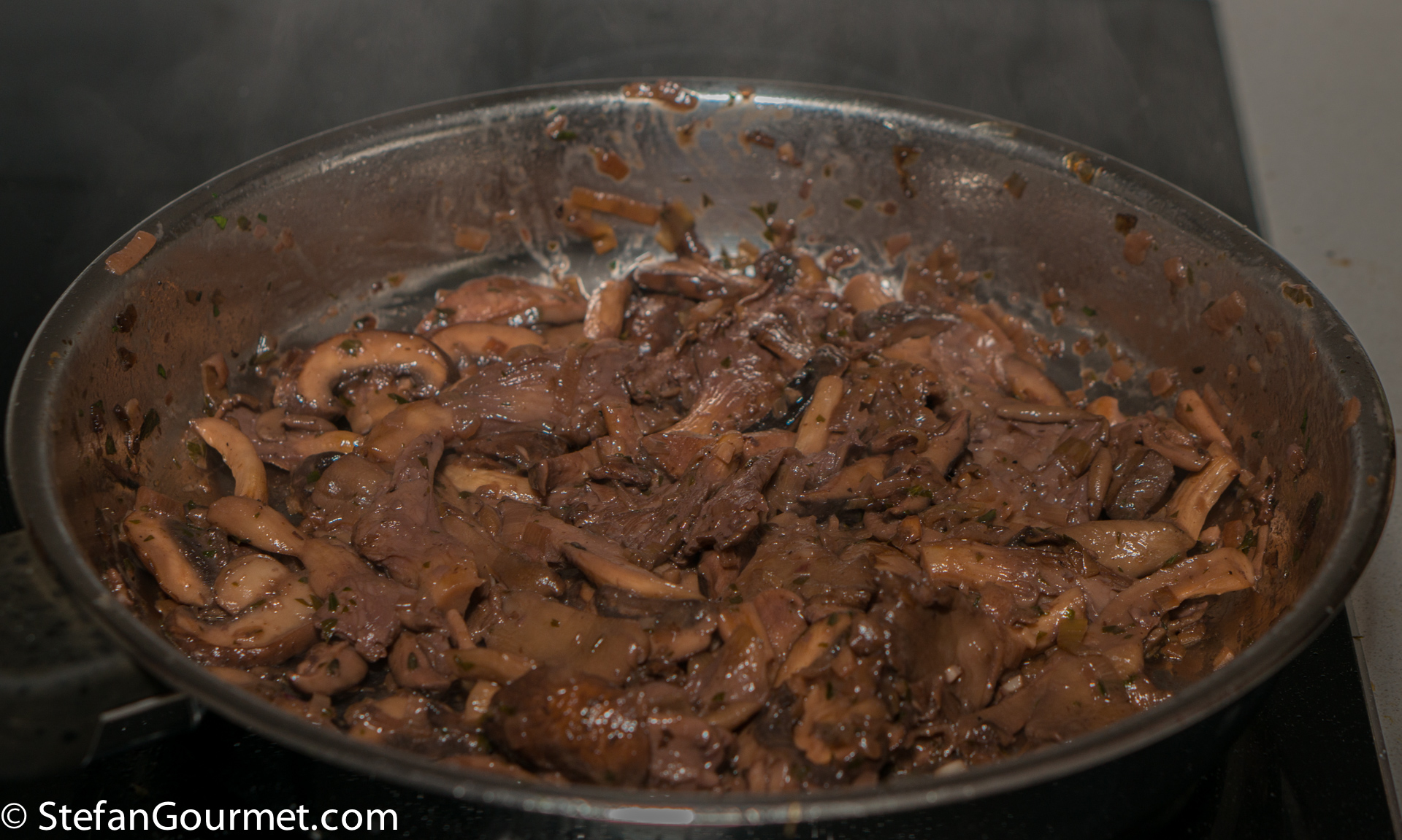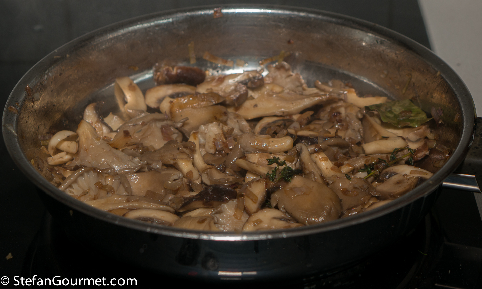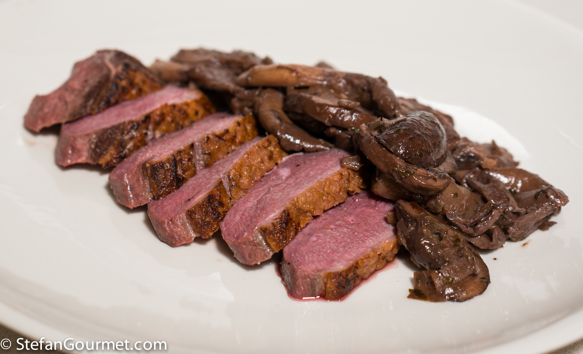 Another niece turned 18 and so it was time for another bottle of the same 1998 Barolo, but this time for Dana. I thought it would be nice to cook something with duck breast for her, which already works with Barolo, but would work even more with some mushrooms added to the mix. And so that is what I prepared. This dish is relatively simple, yet delicious and elegant and perfect for the holidays. Cooking the duck medium rare is of paramount importance to make it tender and tasty. For best results, you can finish cooking the duck sous-vide or in the oven. For the latter you should use a thermometer with a probe to avoid undercooking or overcooking the duck. Note that no butter or oil is used for this recipe, everything is cooked in the duck’s own fat to get maximum duck flavor.