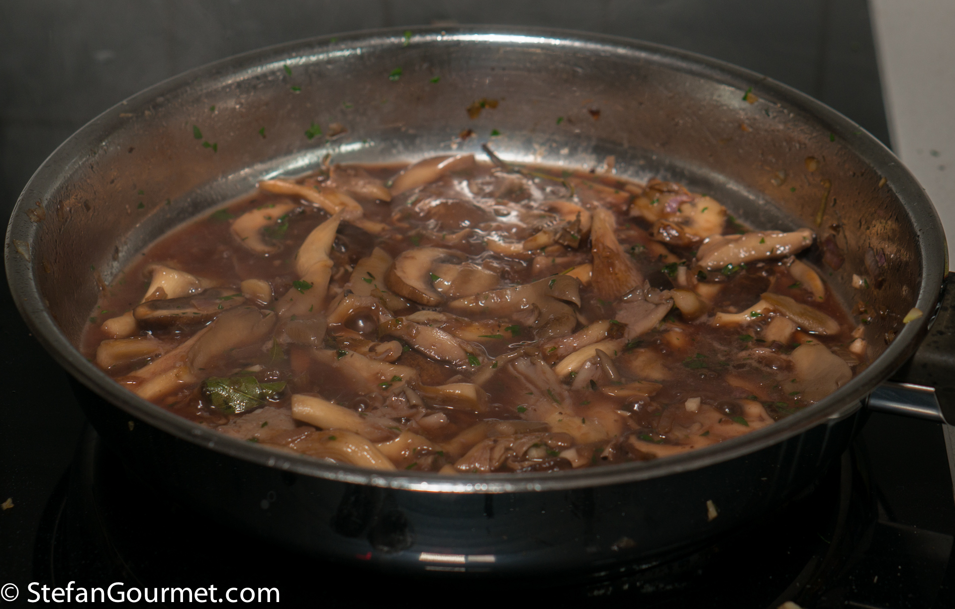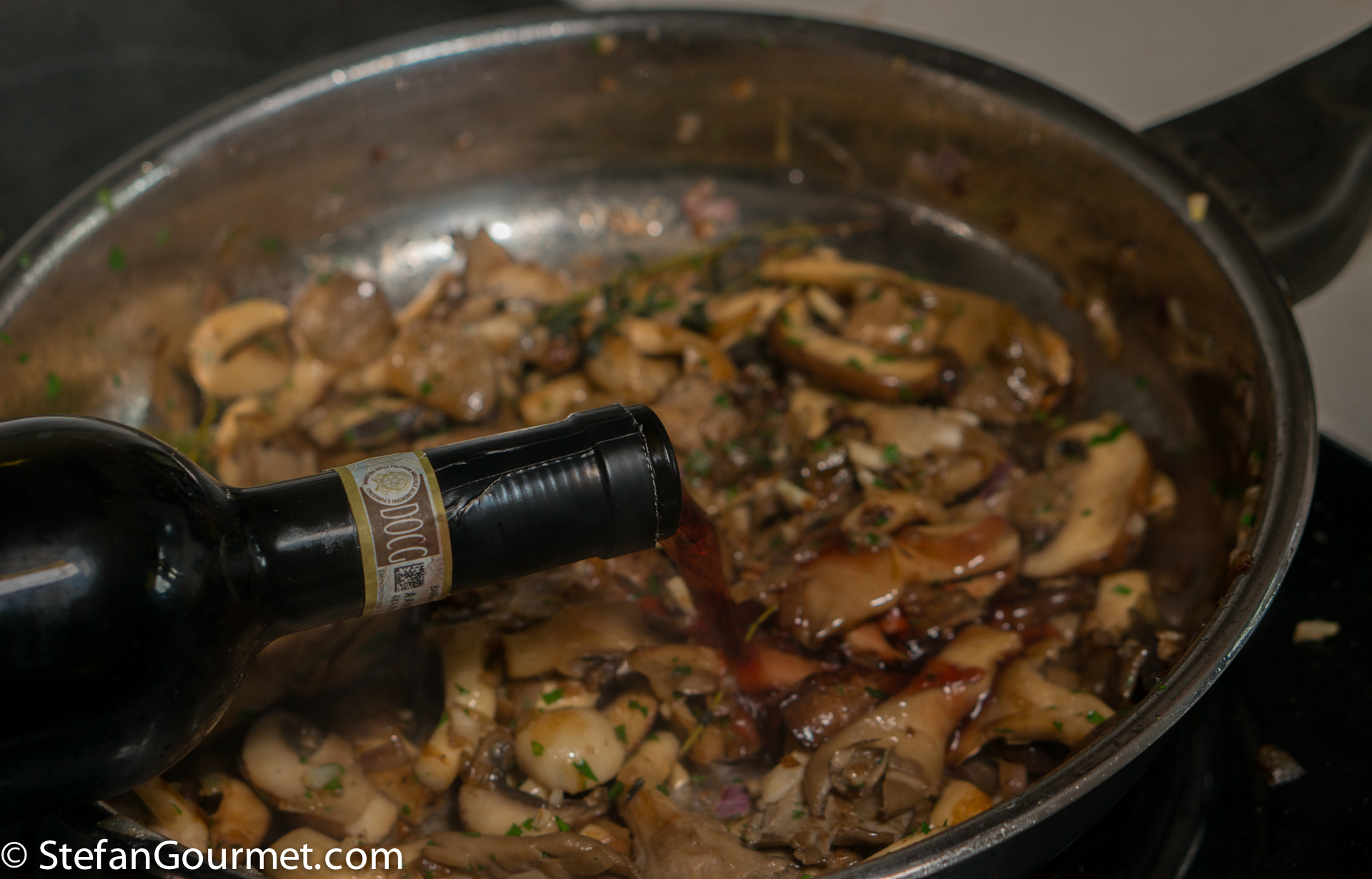 Simmer until most of the wine has evaporated or been absorbed by the mushrooms. Taste and adjust the seasoning with salt and freshly ground black pepper.
