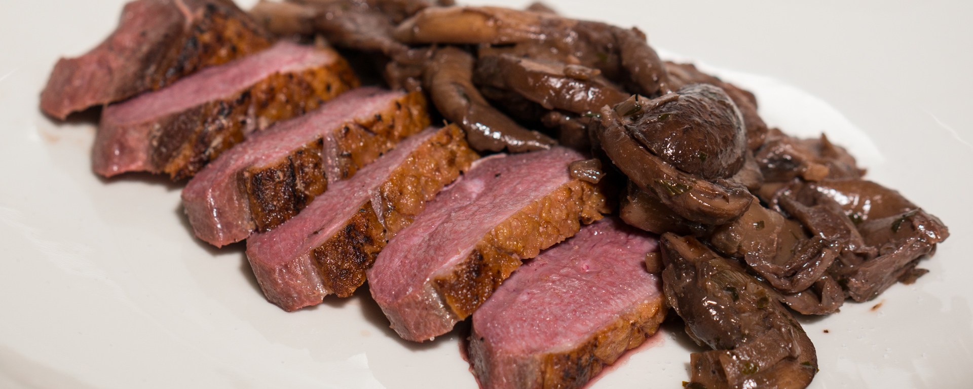 Slice the duck and serve with the mushrooms on preheated plates. Season the duck slices lightly with salt.