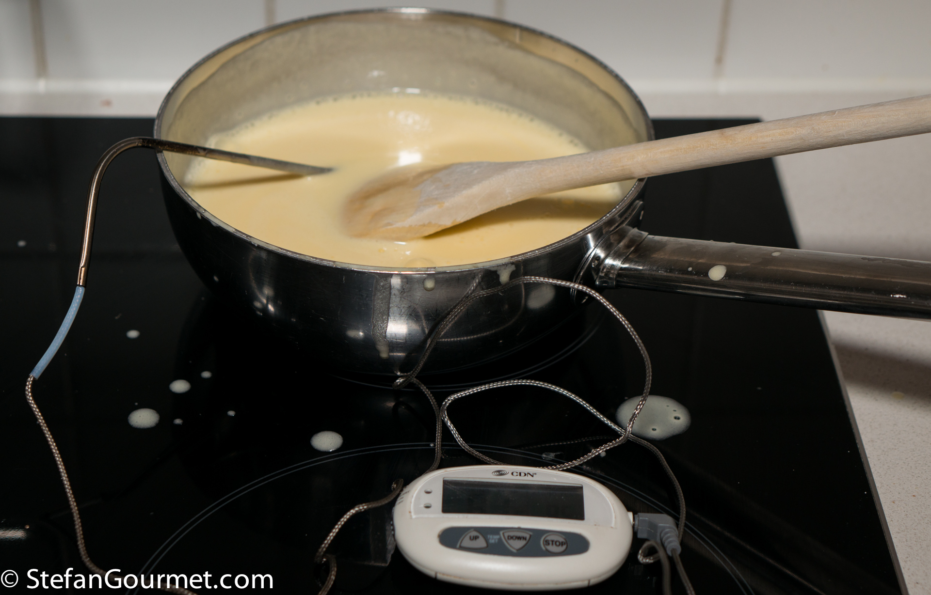 Heat this mixture in a saucepan, stirring constantly, until it reaches a temperature of 85C/185F. You have now made crème anglaise.