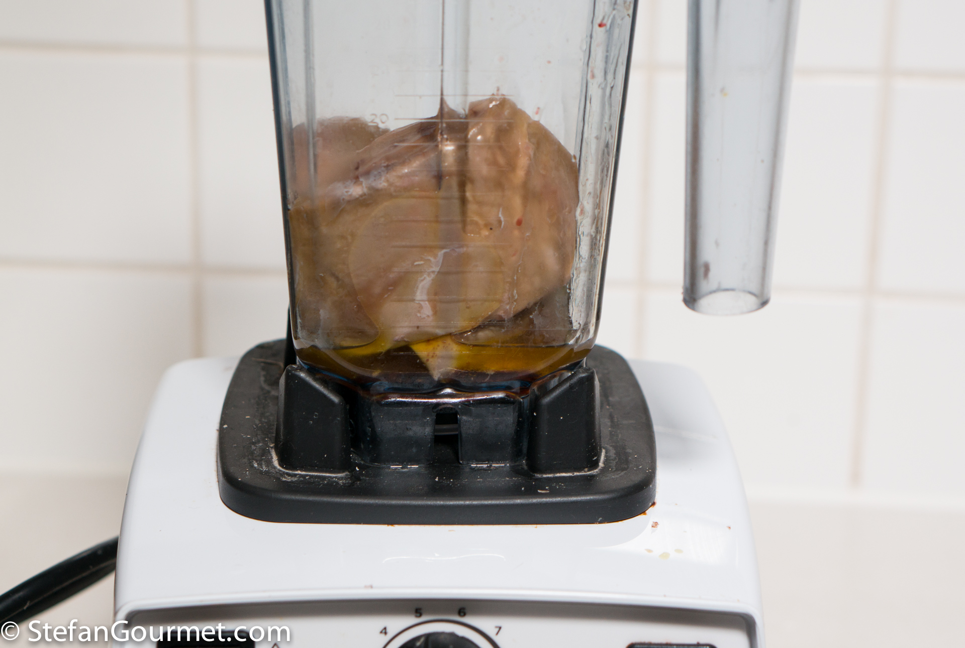 …and cook sous-vide for 2 hours at 57C/135F. This will pasteurize it. It is best to remove any veins from inside the foie before cooking, but because mine was frozen I didn’t bother. You won’t notice it anyway after the foie has been pureed.