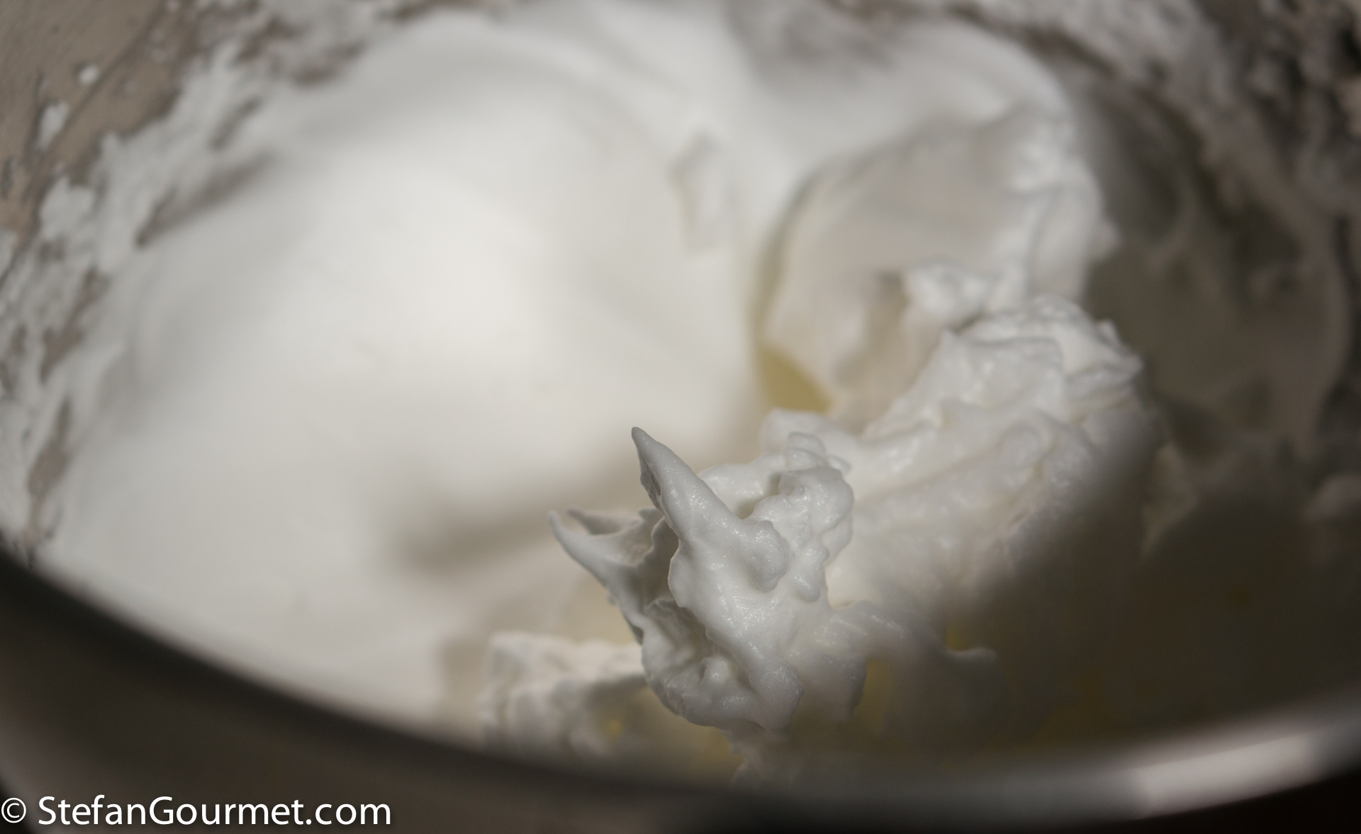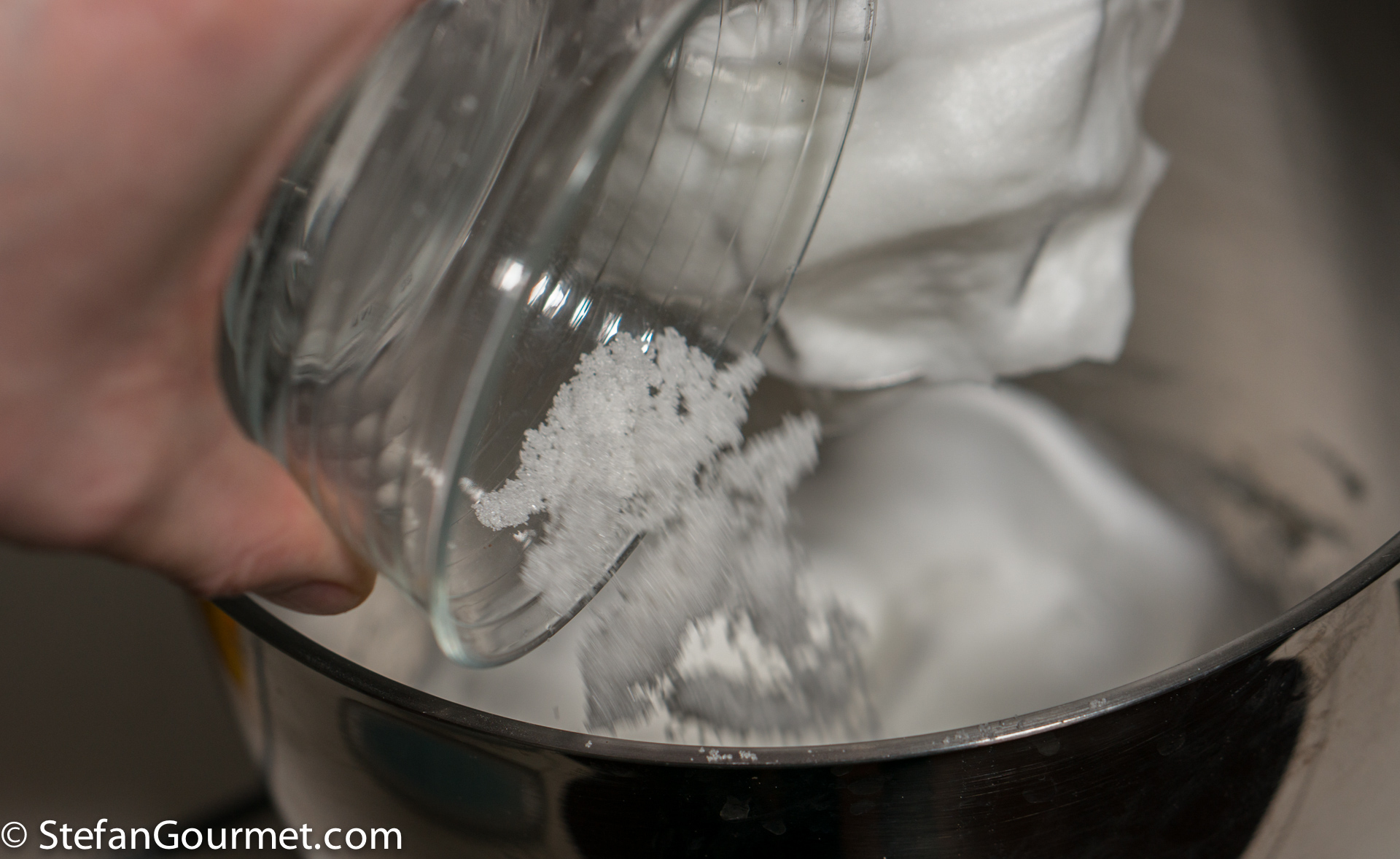 Whisk 3 egg whites in a clean bowl with clean beaters until the soft peaks stage, then add the remaining 2 tablespoons of caster sugar.