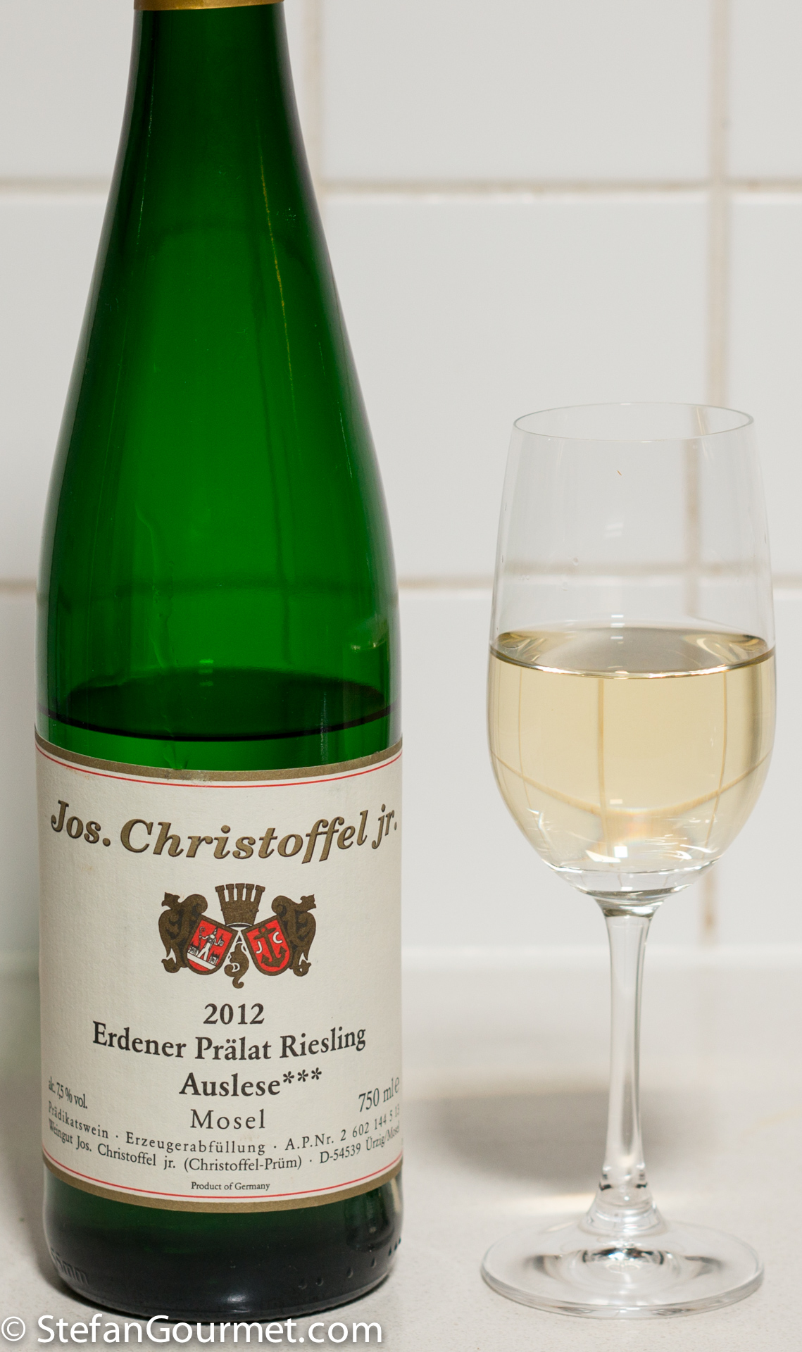 This cake is lightly sweet and tart from the yogurt and citrus, so it works very well with a Riesling Auslese from Germany. In this case it is a Mosel Auslese with three stars, which means that only the best grapes with a lot of botrytis have been used to make this wine. Since it only has 7.5% alcohol by volume, there is quite a bit of residual sugar despite the cool climate along the Mosel. The mineral notes in the wine work very well with the citrus and yogurt.