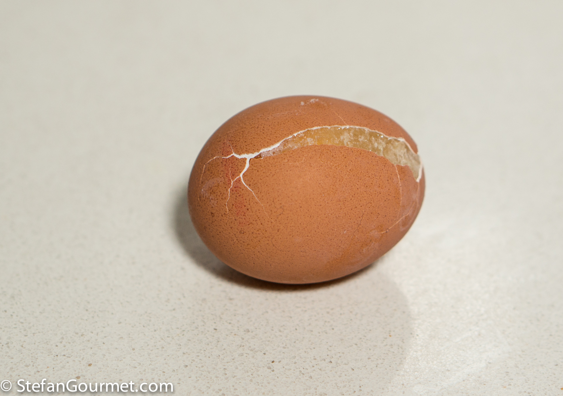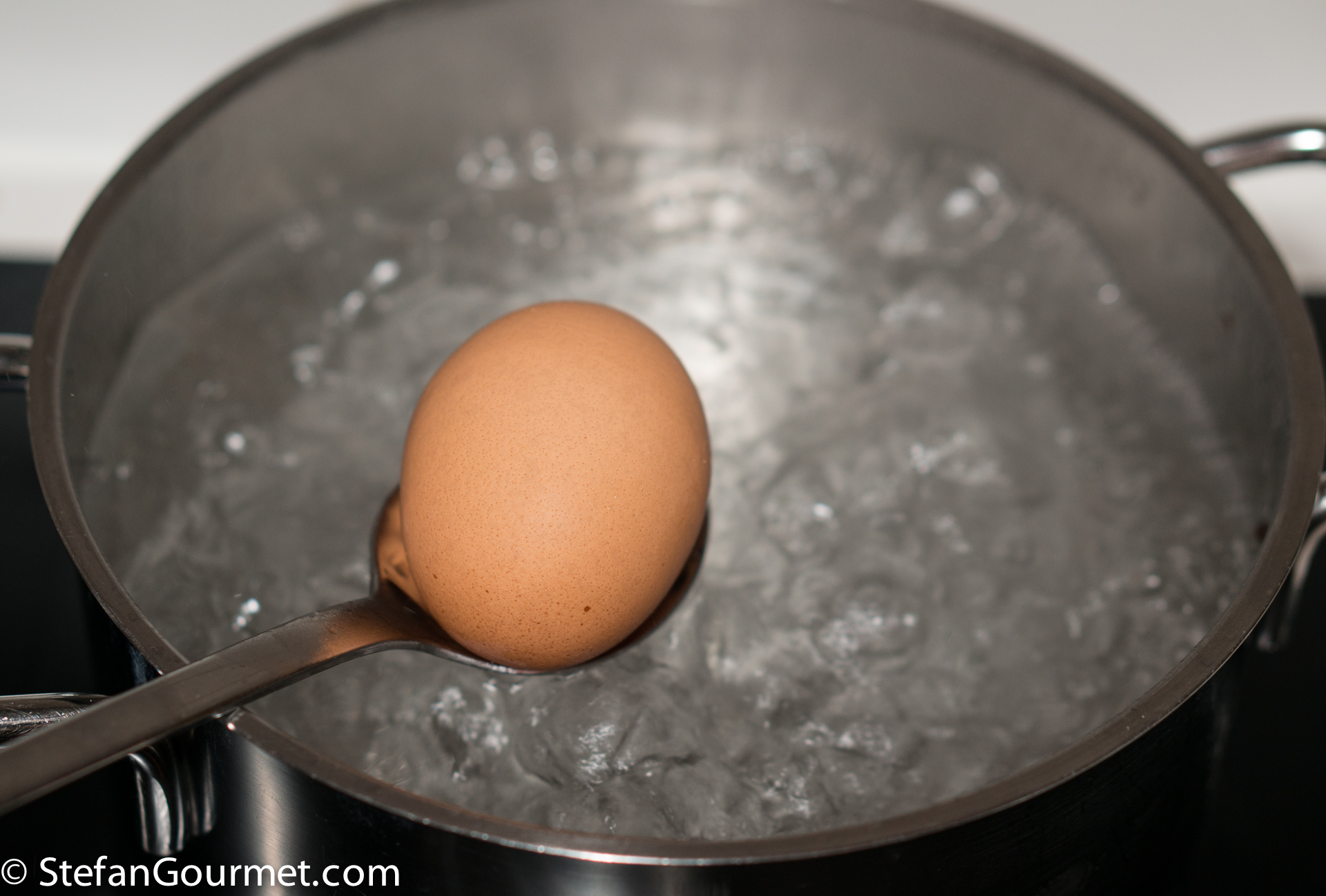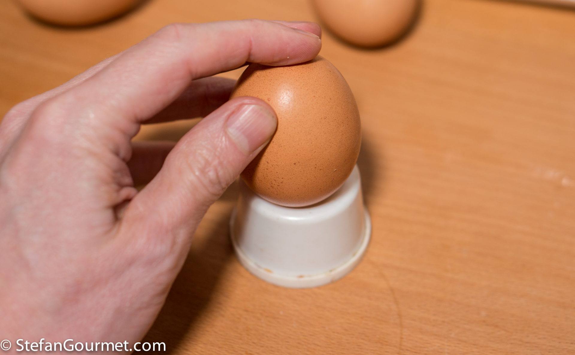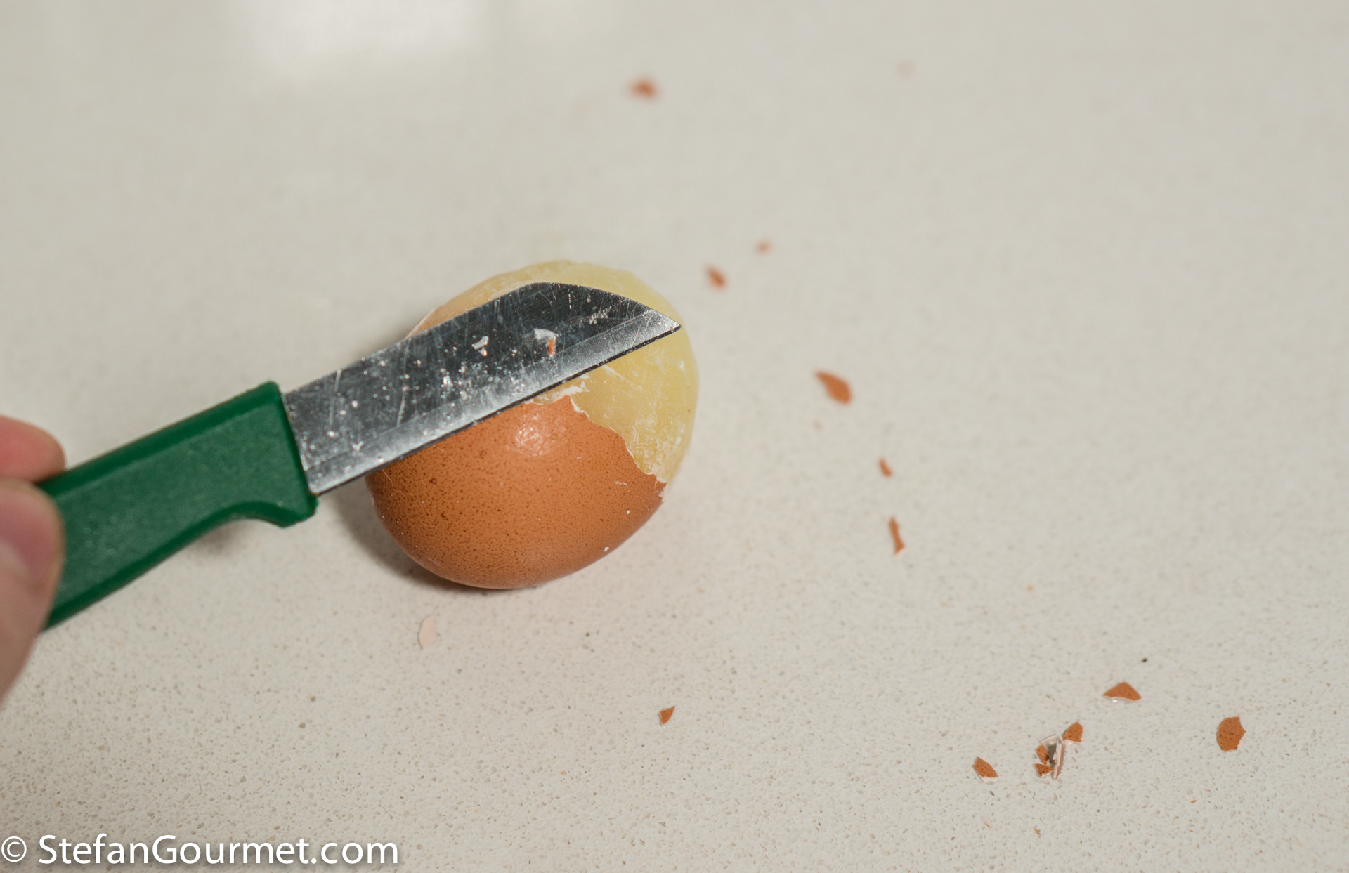Eggs was the first thing I tried sous-vide six years ago. I have tried many eggs at many temperatures, but never ever a single egg came out cleanly from its shell after cooking sous-vide. I didn’t try sous-vide for this recipe because the yolk needs to be softer than the white. The white needs to be quite firm to allow to peel it without the white breaking. Hard boiled eggs would be a lot easier, but not as special.