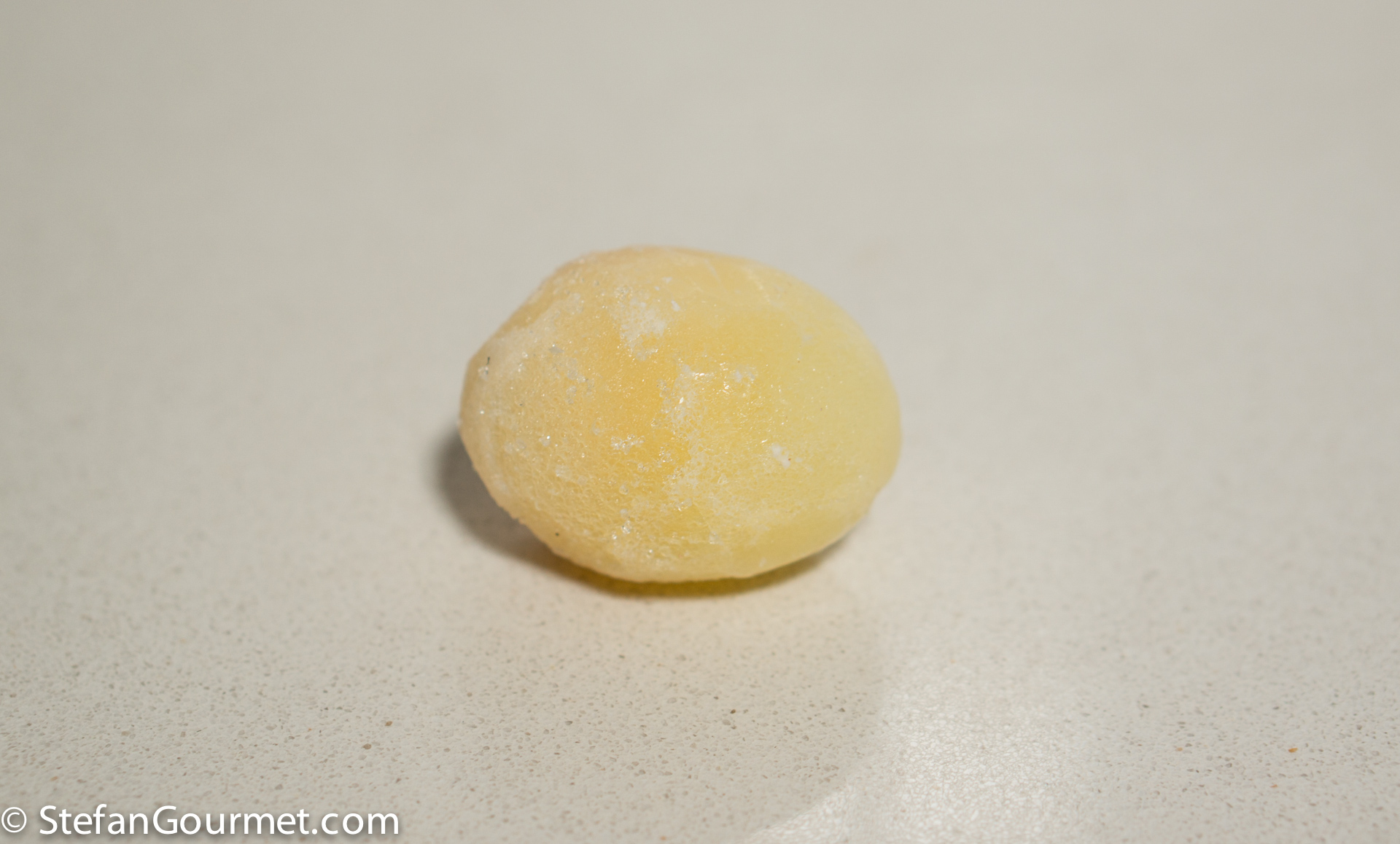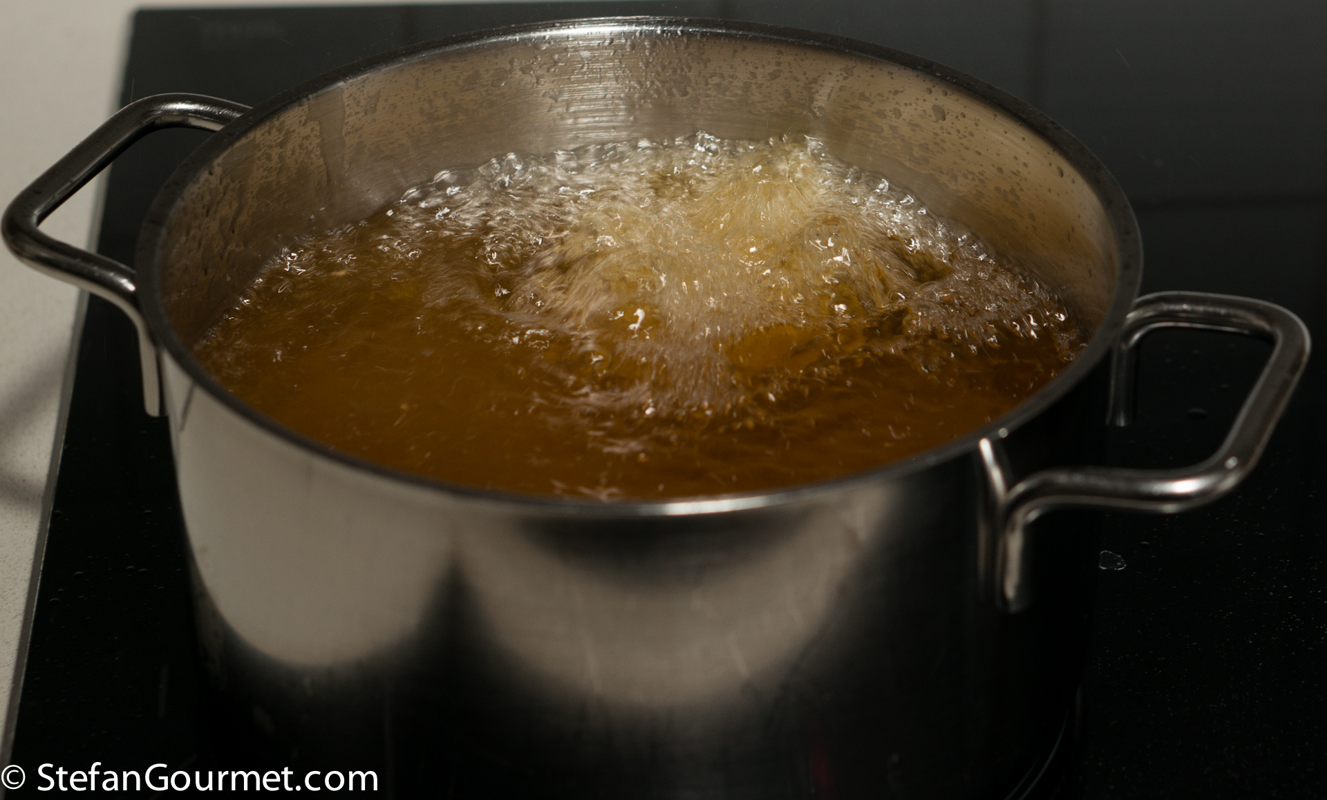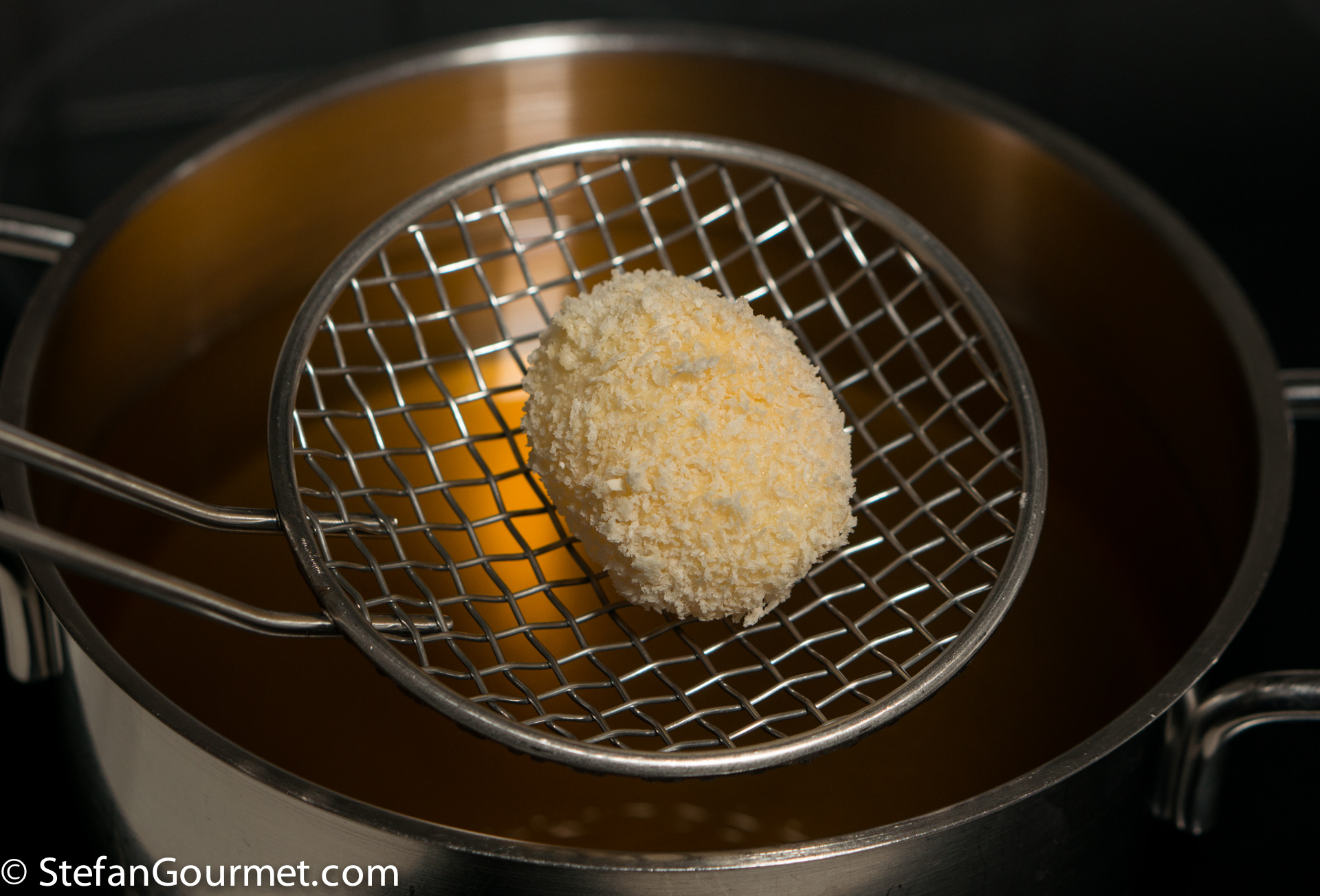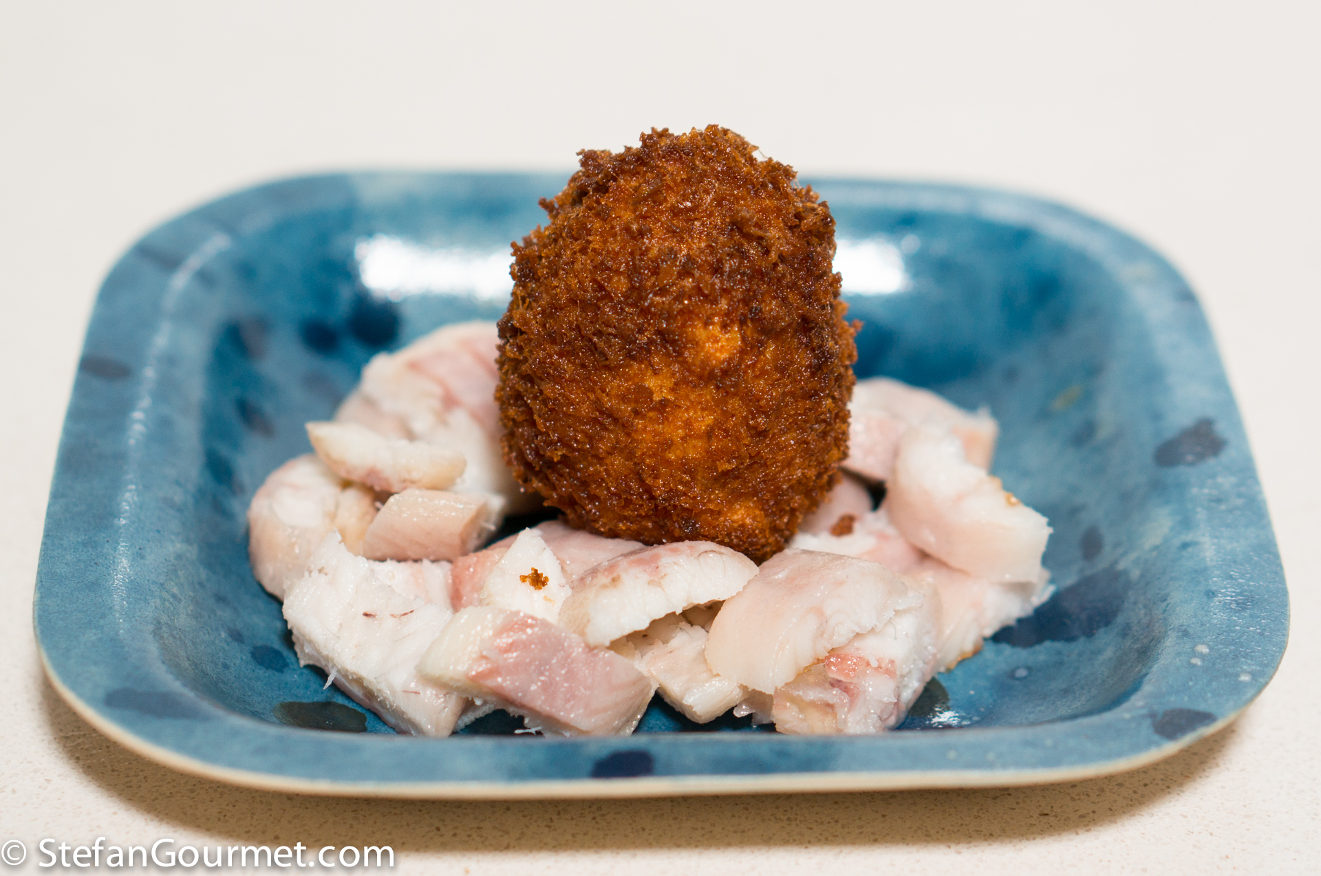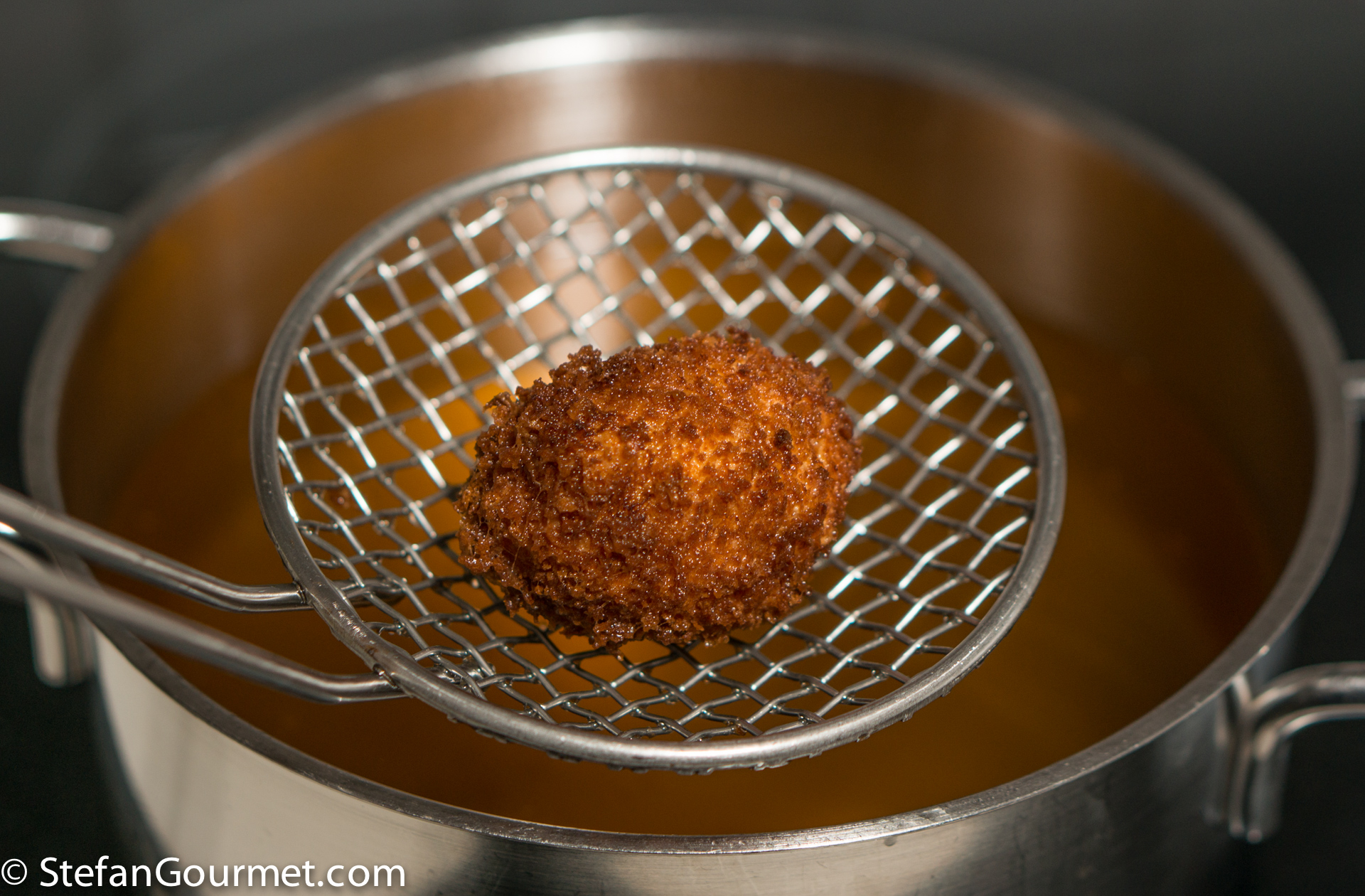 The crust was a bit too thick and a bit too dark (because the oil had been a bit too hot), and although the egg yolk was runny the egg did not have the proper texture and it wasn’t completely warm, because in the end I caved in and froze the egg after all to get at least some result. This was after boiling and trying to peel about a dozen eggs, and each of them breaking before I got less than half of the peel removed. Nowhere near the 60% success rate at Librije, but of course they have been serving these eggs on a daily basis for a while, so they’ve had much more practice and time to figure out how to do this.