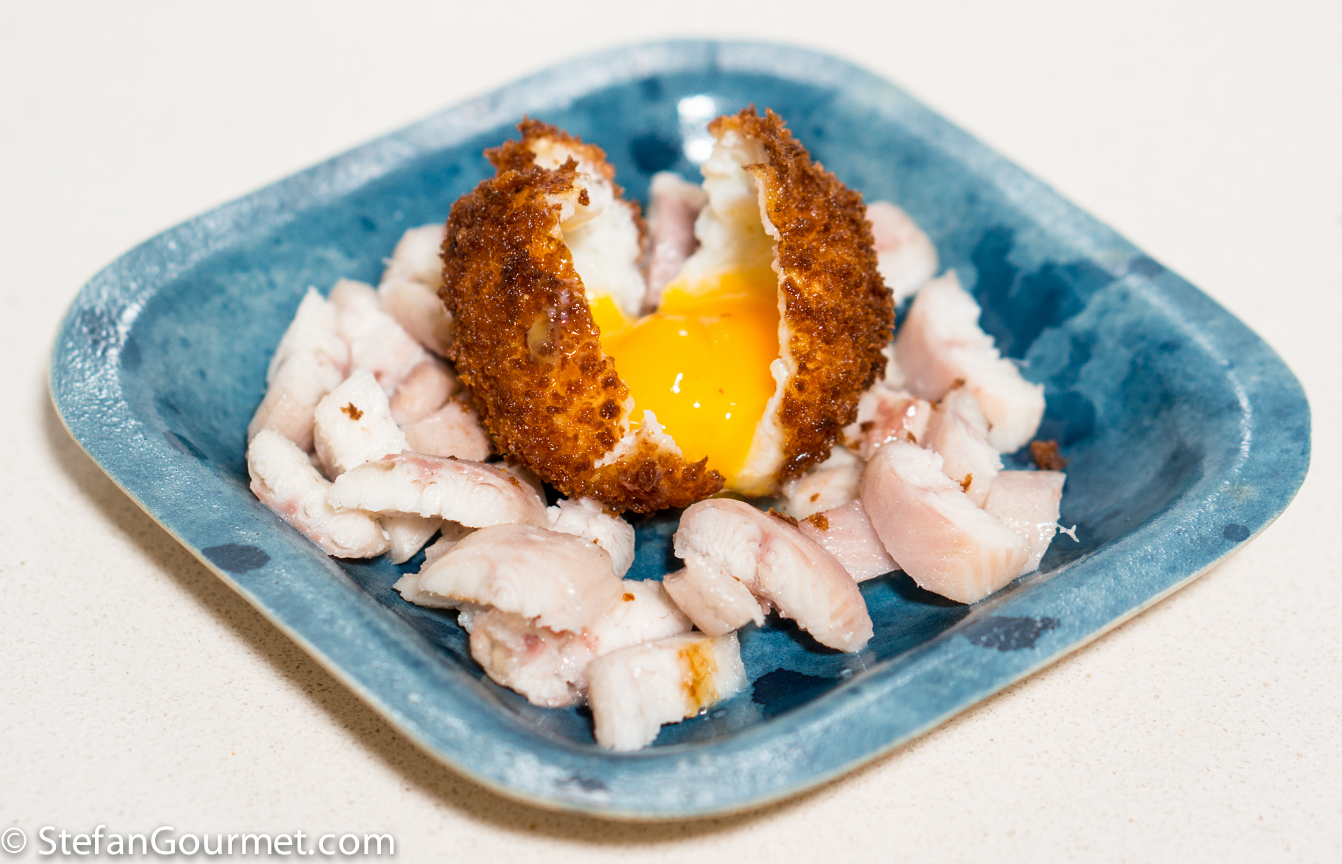 After the positive reactions to the report of my failure trying to make oyster sauce from fresh oysters, here is another experiment that didn’t turn out so well. The photo above is the “crispy egg” we got served for breakfast at Librije last December. It was amazing: a light and very crispy crust with a perfect soft-boiled egg inside, served on a bit of smoked eel salad. We asked the sous-chef who brought this to our table how it was made, if perhaps the egg had been frozen? He said they boiled the eggs briefly, then peeled them very carefully, followed by breading and deep frying. He also mentioned that they only managed to peel 6 out of 10 eggs without breaking them. This came from the kitchen of a restaurant with 3 Michelin stars, so perhaps I should have known better to try to recreate this at home. But it was so good that I thought it was worth a shot.
