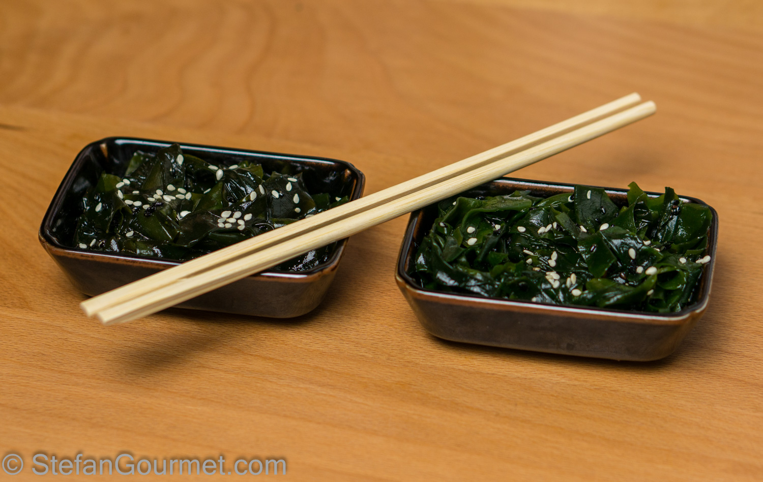 Seaweed is healthy and delicious, and it is pretty simple to make your own wakame seaweed salad. With a soy, sesame and chili dressing the crunchy seaweed is a delicious appetizer or snack. Wakame salad is usually made from reconstituted dried wakame, but when I saw fresh salted wakame, I decided to try that to compare. The verdict is not surprising — the fresh wakame has a nicer texture and more complex flavor. But both are delicious.