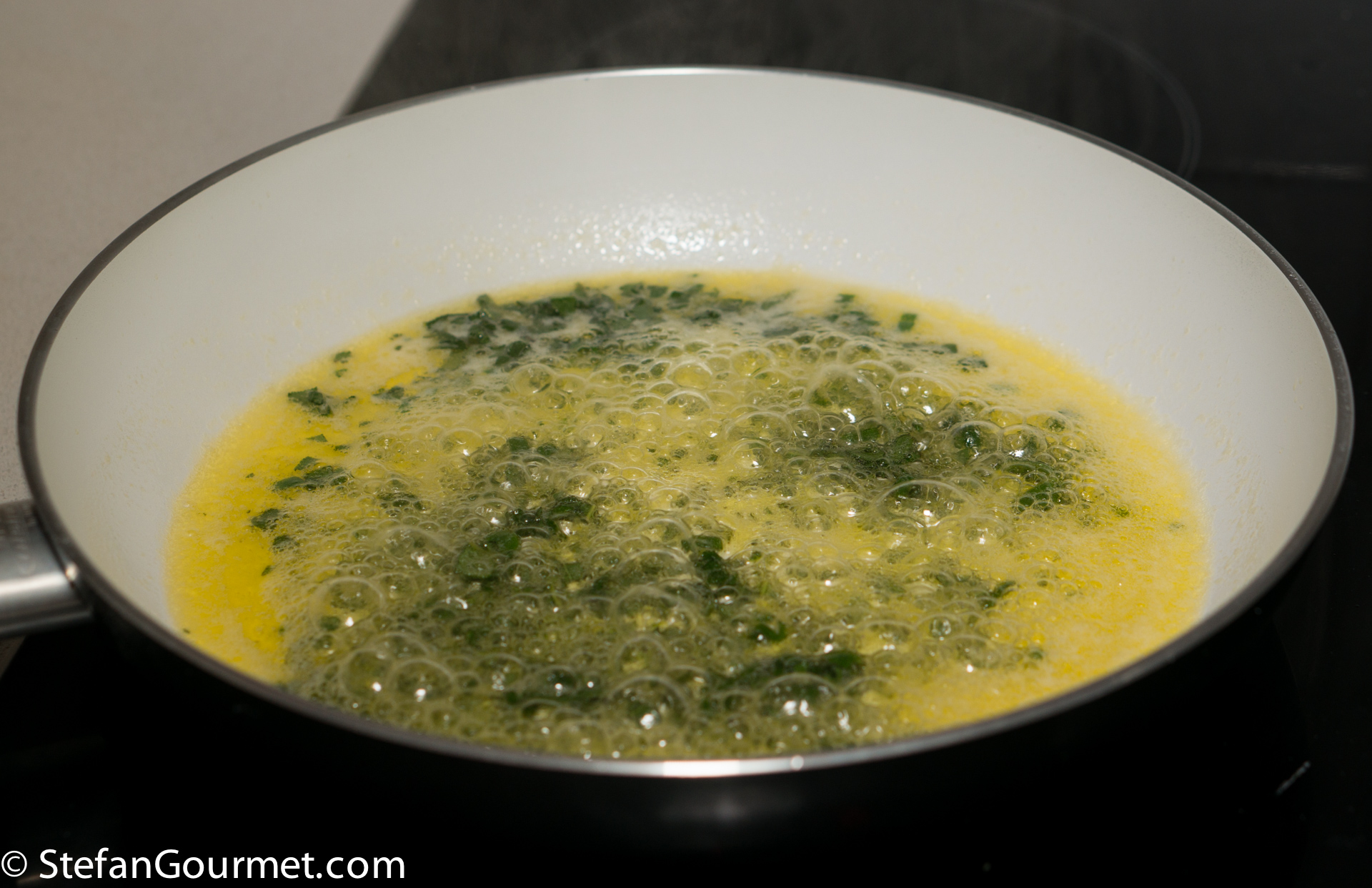 When the butter foams, add half a tablespoon of minced fresh sage leaves for every tablespoon of butter. Reduce the heat to very low.