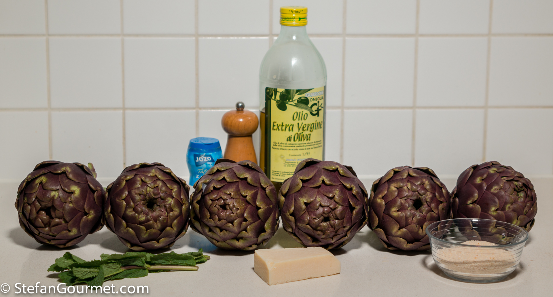 I don’t prepare artichokes very often, because they are usually too expensive for what will be left after you clean them. This is what I commented when Jo of Frascati Cooking That’s Amore recently blogged about a recipe from Lombardia for oven-roasted artichokes with parmigiano, breadcrumbs, and mint. Lo and behold, just a few days later artichokes were on sale. And so I decided to try the recipe after all. In Dutch we say “someone who has been warned is worth twice as much”, and so I took Jo’s warning to heart that the artichokes may turn out woody if you don’t clean them “unsparingly” or if you don’t blanch them for long enough. And they turned out great! As usual with Italian recipes, with only a few ingredients this yields something wonderful. Thank you, Jo!