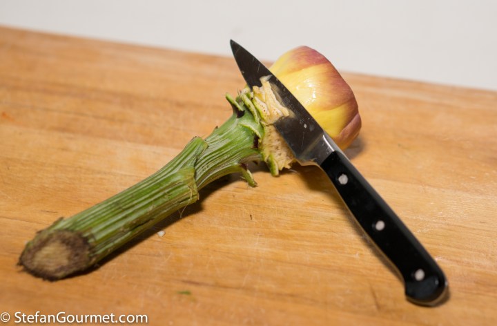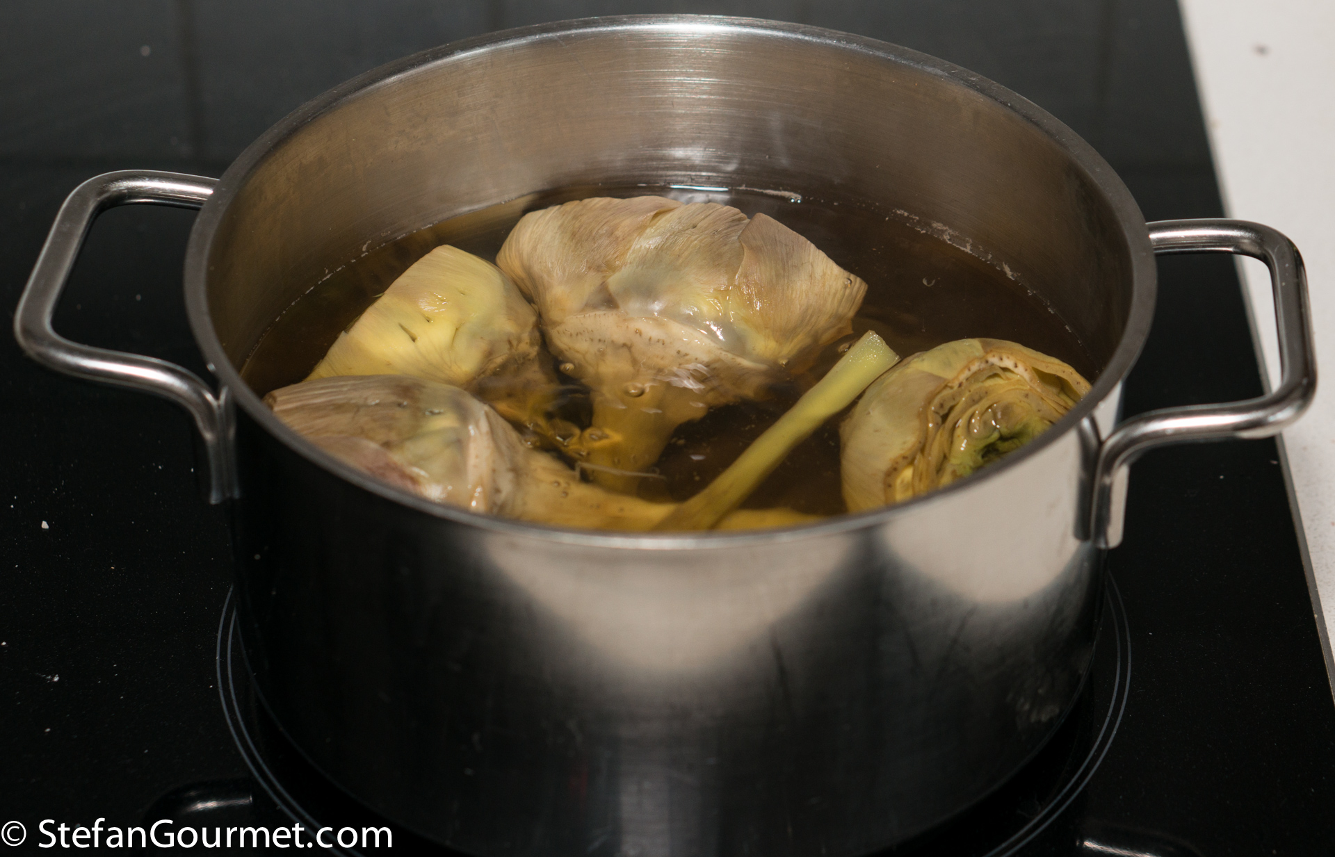 The nice thing about serving artichokes with a vinaigrette is that you can leave more leaves on them and scrape off the tender flesh with your teeth while eating. I don’t serve them like that for dinner parties though and Kees doesn’t like eating like that. So I end up with more elaborate preparations.