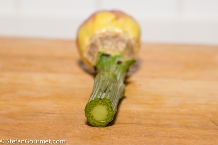 Cut the artichokes into halves. Remove any tough inner leaves or ‘hay’ that you will find inside. Then fill with the breadcrumb mixture. Reserve some of that mixture for the stems.