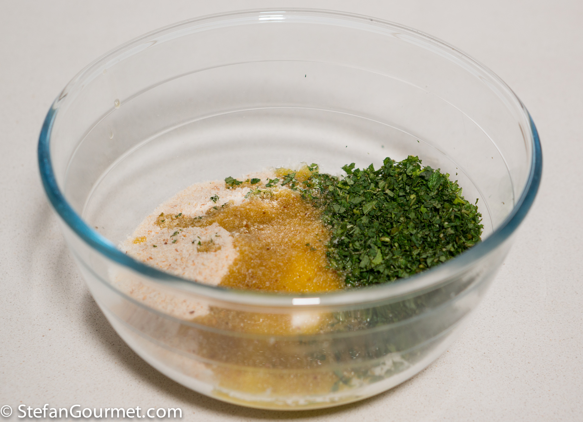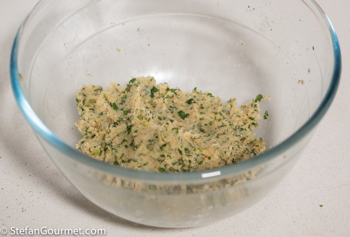 In a bowl, combine 50 grams breadcrumbs, 80 grams freshly grated parmigiano reggiano, 60 ml extra virgin olive oil, 2 tablespoons minced mint, salt, and freshly ground black pepper.