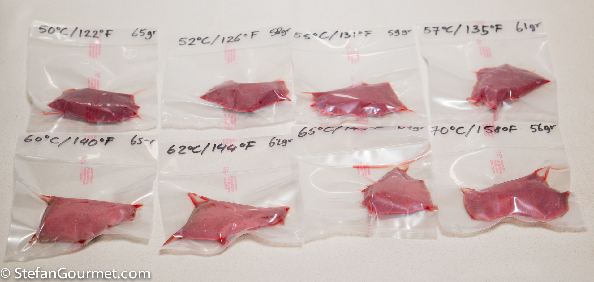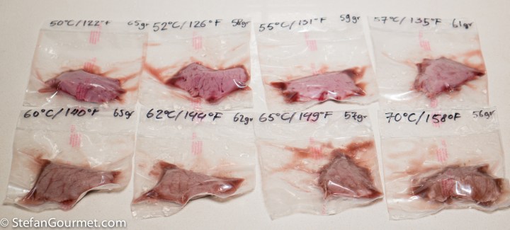 Then I cooked each one sous-vide for 15 minutes at the indicated temperature. Since the pieces of steak were only about 1 cm (less than 1/2 inch) thick, 15 minutes was enough for the core temperature to reach the target temperature.