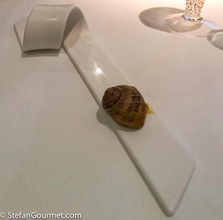 Note the ‘trail’ left behind by this snail. The snail, served in its own shell, was crispy and combined with a delicious cumin sauce.