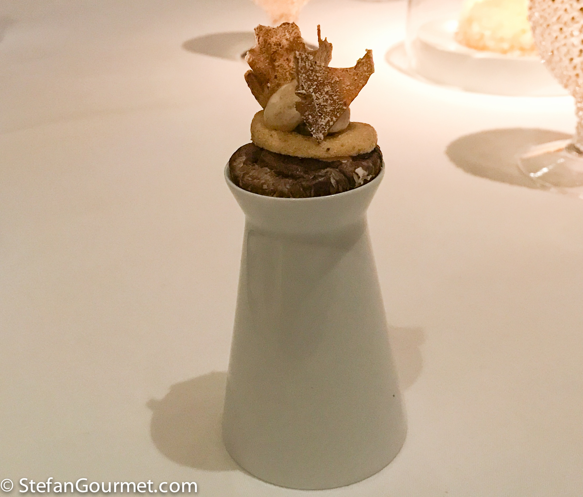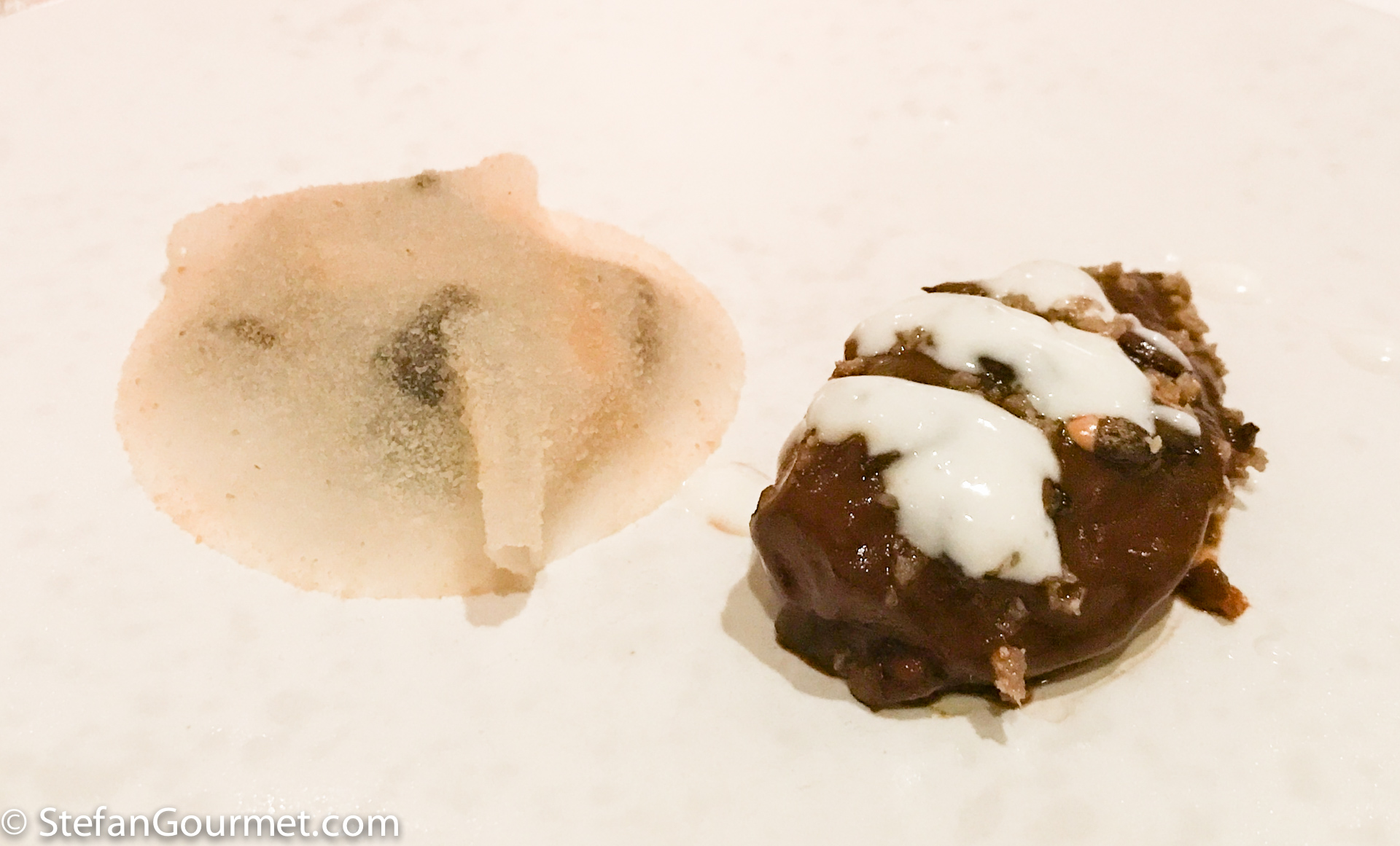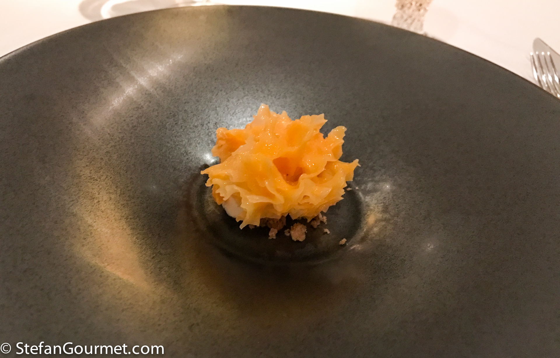 The object turned out to be Tremella, a Chinese type of mushroom, that didn’t have much flavor by itself, hence the buckthorn juice. It was served with orange blossom and caramelized butter. The accompanying late harvest Huxlrebe from Germany was very nice with it. 9/10