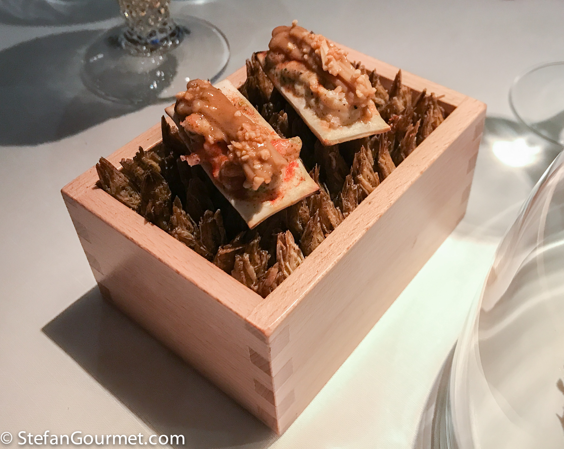 All the amuse worked very well with the champagne, but for the last one the first wine of the wine pairing was served as that worked better, and indeed it worked very well. This was shrimp with peanut sauce, served on an ‘army’ of deep fried shrimp heads (that you could snack on as well).