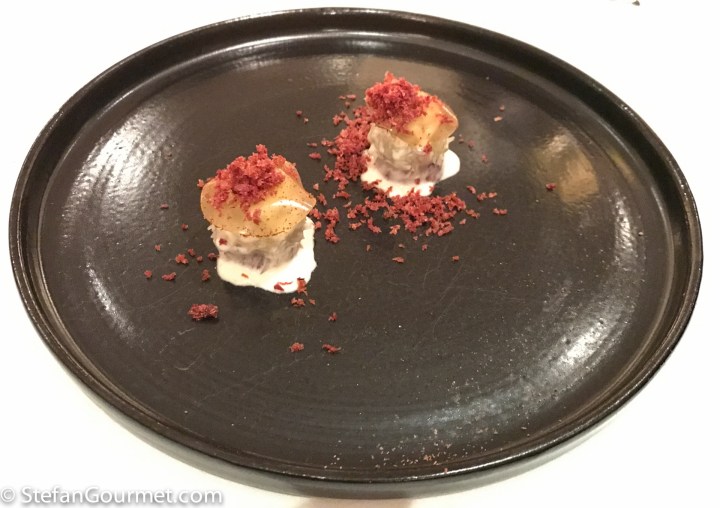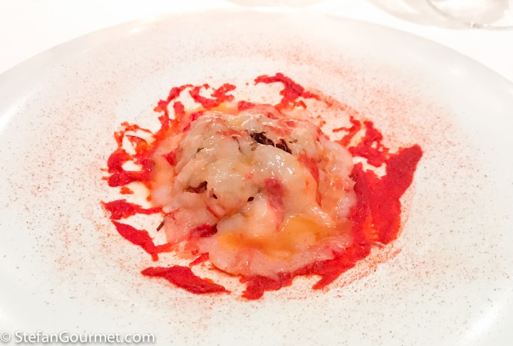 The second dish was perhaps the best dish of the evening, but certainly not the most photogenic. Raw carbinero prawn on crispy strands of short rib (‘pulled’ short ribs, then deep fried) with roasted bell pepper, ginger, water melon, and X.O. cream. Wow. What a wonderful combination of flavors and textures. The short rib strands looked like (but of course did not taste like) threads of saffron. There is a lot of going on here with the ginger, bell pepper, and water melon, but every part played its role and it was simply wonderful with the creamy, again impeccably fresh, prawn. Of course there was also pimentón (paprika) sprinkled on the plate, to make it even more Spanish. This was paired with a blend of Weissburgunder, Sauvignon Blanc and Sipon (Furmint) from Slovenia. A complex wine that worked wonders with this complex dish. It was interesting to note that the wine had some ‘petrol’ going on, which is more usual for Riesling from Alsace or Germany. 10/10