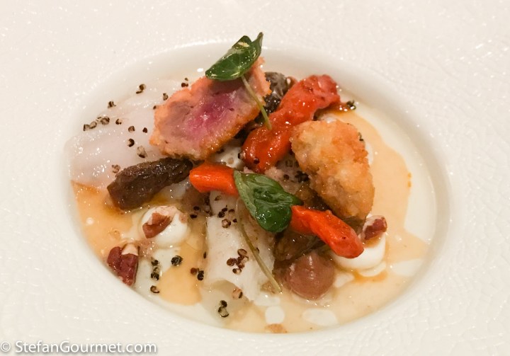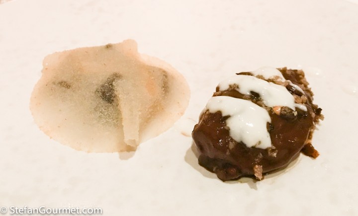 North Sea Crab and Veal Marrow, with grated veal tongue, cinnamon, oyster, and kaffir lime. Again an impressive dish with wonderful flavors, paired well with a Riesling from Waipara in New Zealand. 9/10
