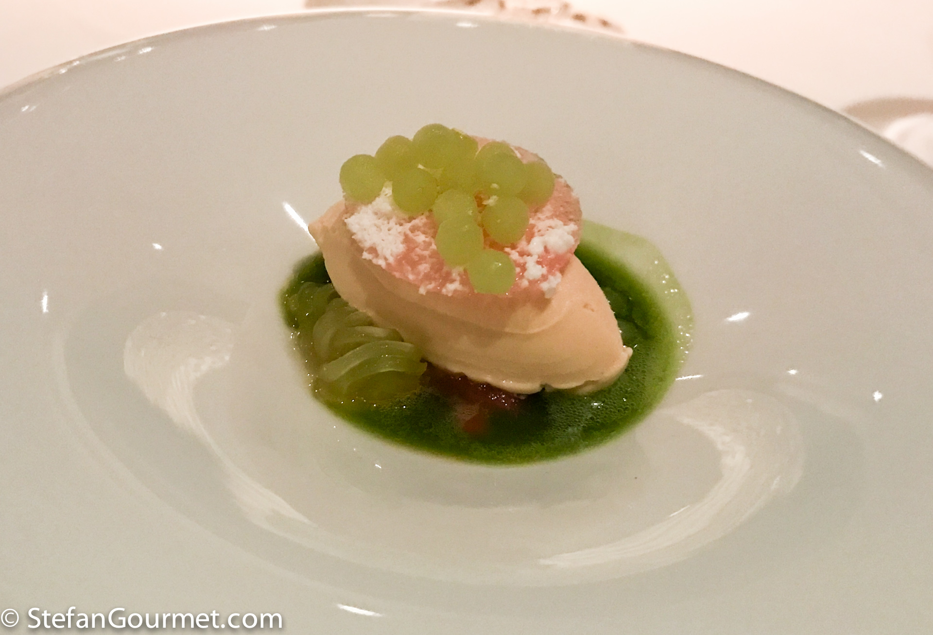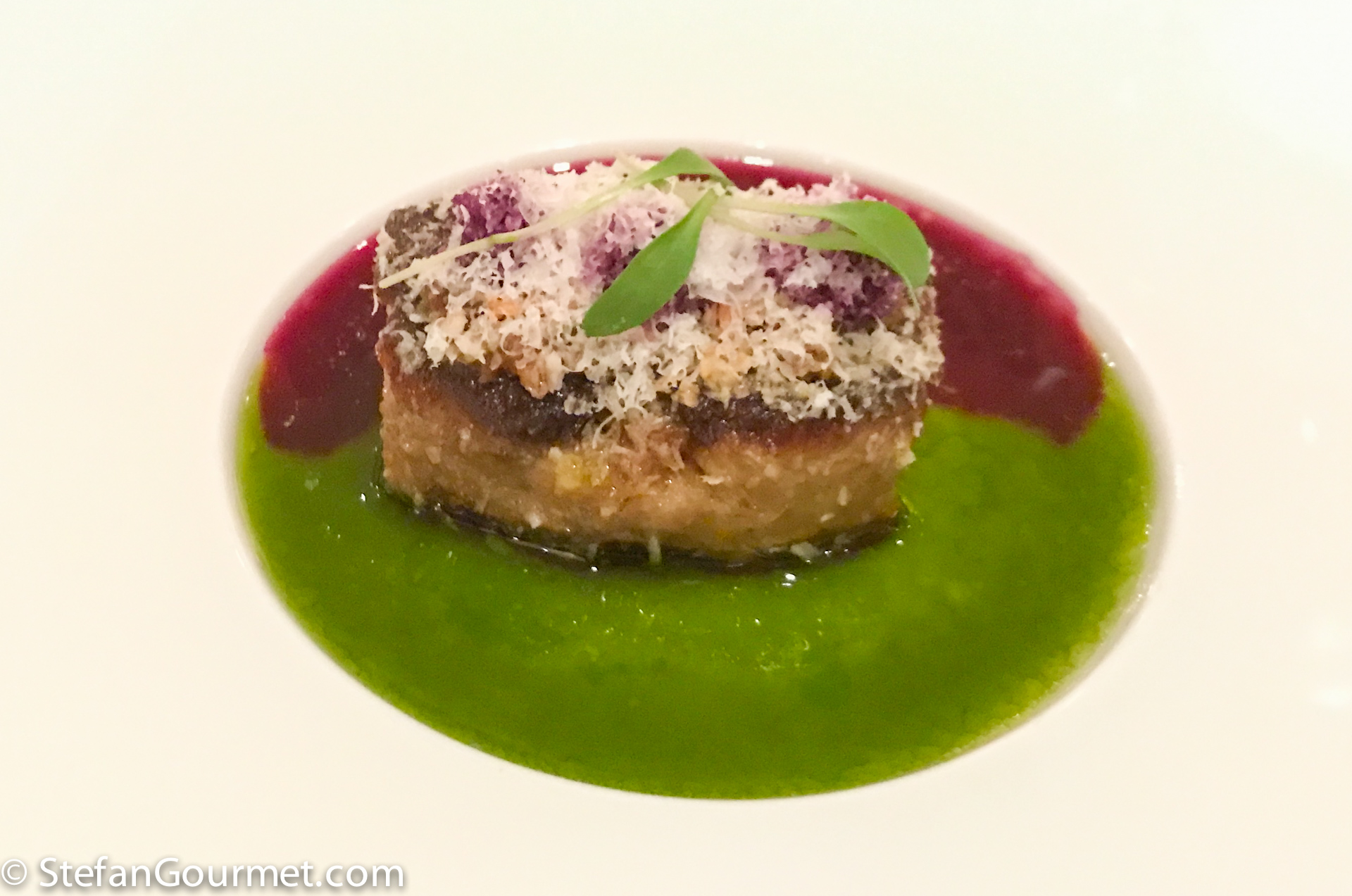Pan fried foie gras with red cabbage juice and cilantro juice, peanut, and coconut. Paired very well with a Jurançon. The foie cooked to perfection, crispy on the outside and juicy on the inside. The cabbage and cilantro juices were great with the foie gras, as they cut through the richness. The wine pairing was very good, with the dish bringing out the complexity in the wine. 10/10