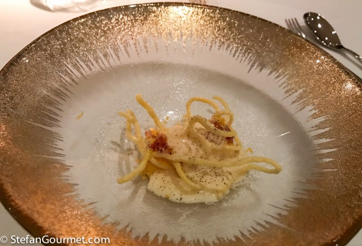 The final course of the menu was a desert version of spaghetti carbonara: crispy spaghetti served with egg yolk ice cream, crispy pancetta, pecorino cheese, and freshly ground black pepper. This was outstanding with a late harvest Tokaji. 10/10