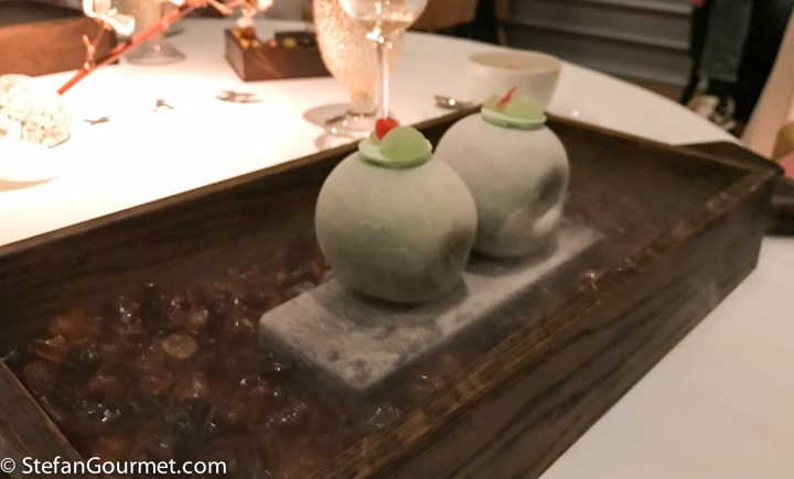 And finally, a green apple martini, served on a green apple that had been frozen with liquid nitrogen. (You couldn’t eat the apple, just the martini on top.)