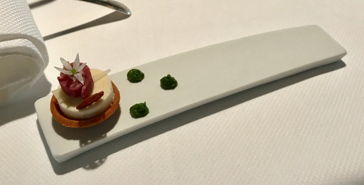 In the dining room the old cogwheels are still there, which makes for a very nice ambiance. We opted for the chef’s ‘surprise’ 8- course menu (105 euros), which was not as surprising because it contained mostly the same dishes as the 5-course menu for 75 euros. The wine list only has French wines, and of course mostly from Burgundy with an impressive selection of Côte d’Or wines.