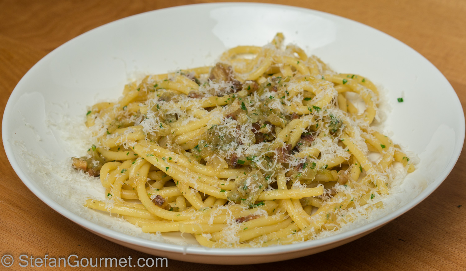 Bucatini alle cipolle is a very simple pasta dish that makes the onions shine by cooking them slowly over low heat. A bit of pancetta is added for additional flavor. The onions are cooked until they are so soft and sweet that they become a sauce.