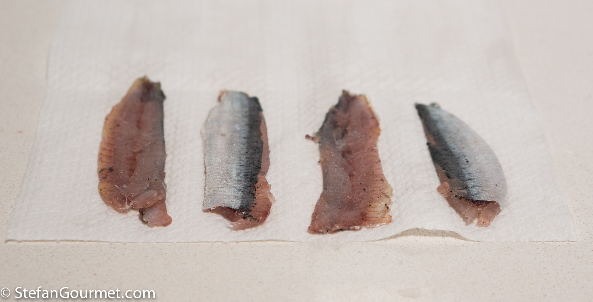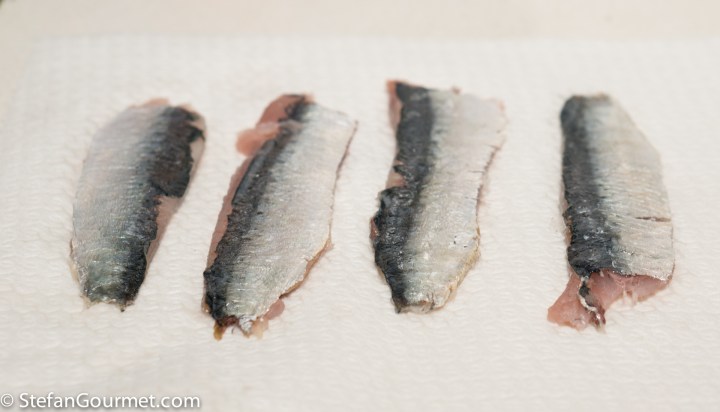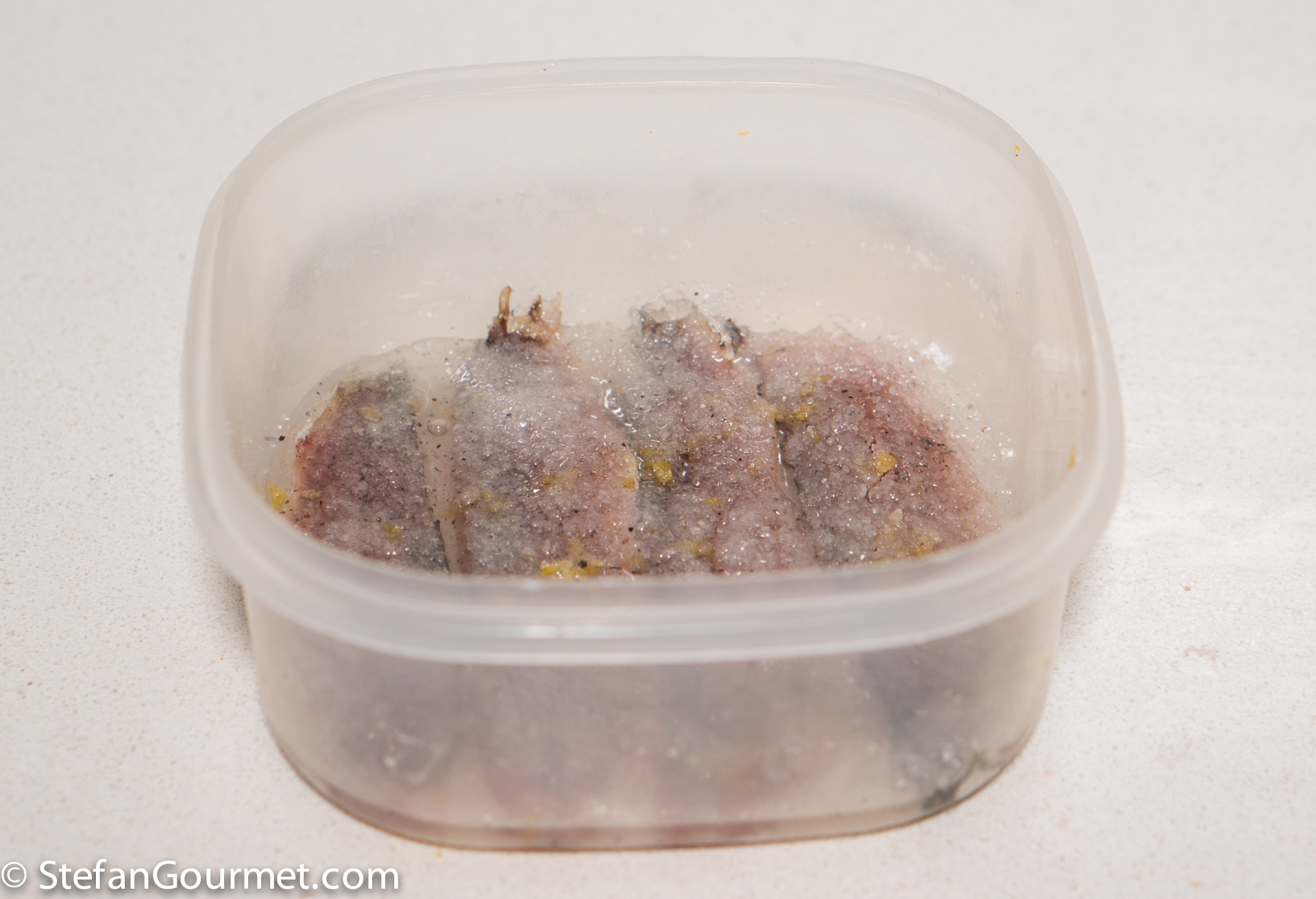 Cover and refrigerate for 45 minutes to 1 hour, not more. As the sardine fillets are thin, this is enough time to cure them all the way through. If you leave them in longer, they will become tough.