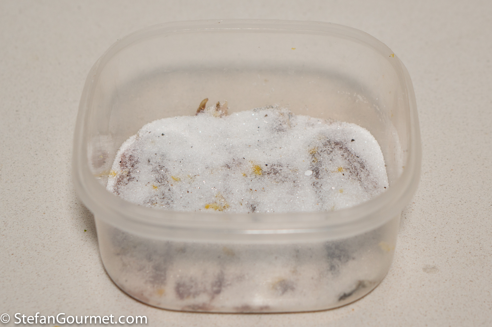 Mix salt with half the weight of sugar. For 8 sardines (16 fillets) I used 200 grams (1/2 cup table salt, more if it is flaky salt) of salt and 100 grams (1/2 cup) of sugar.
