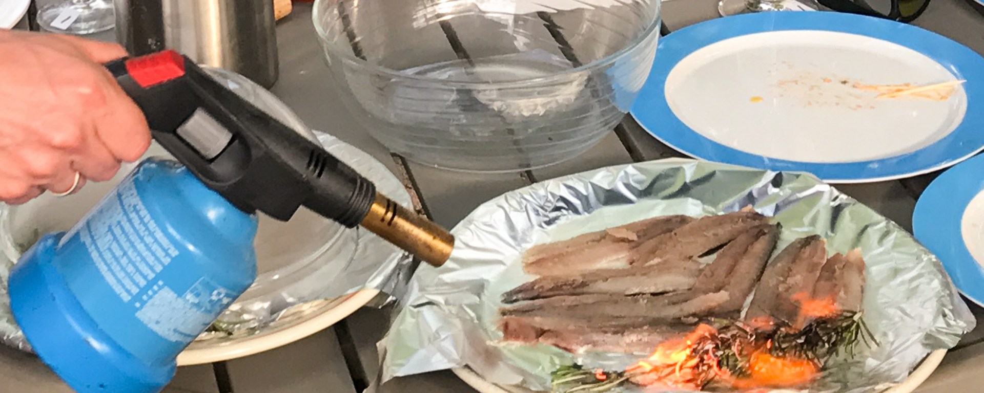 Place the sardines in a single layer, skin side down, on some aluminum foil. Place a branch of rosemary next to it and ignite it.